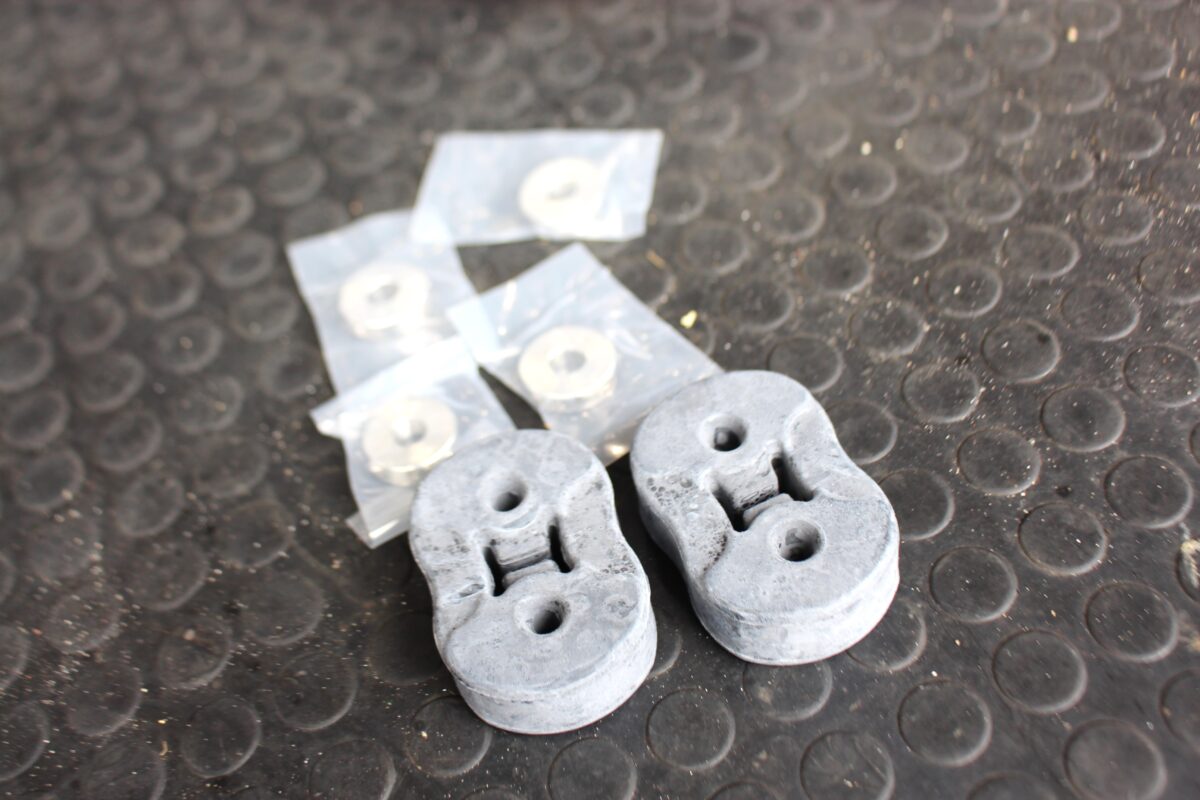 リアアンダースポイラーとのクリアランスを稼ぐためのパーツ、純正よりも少し長い吊りゴムに変更です。