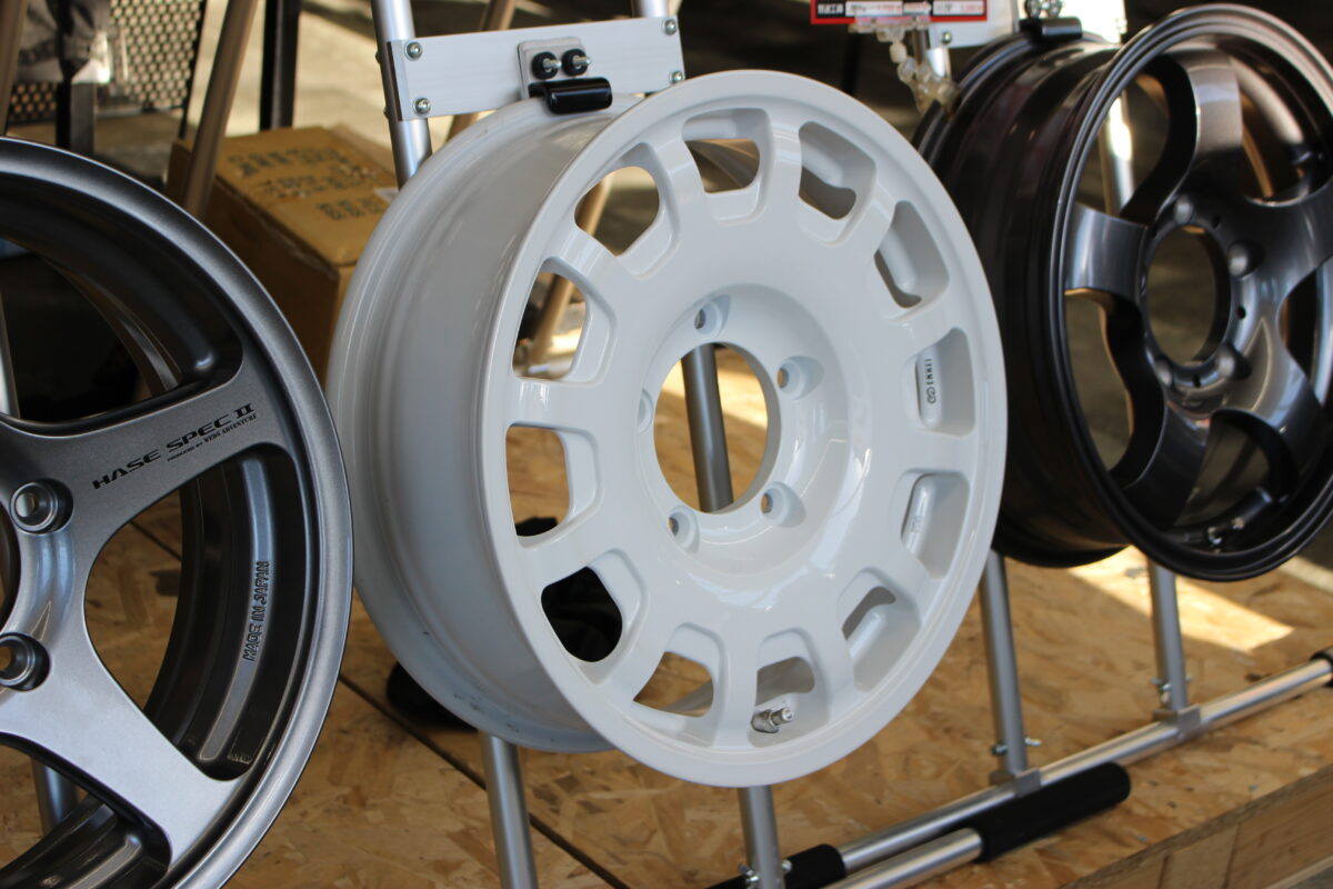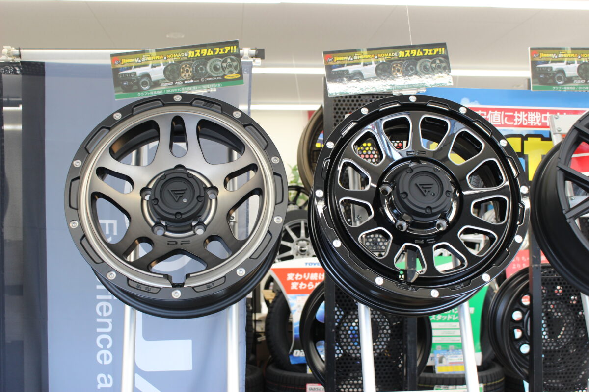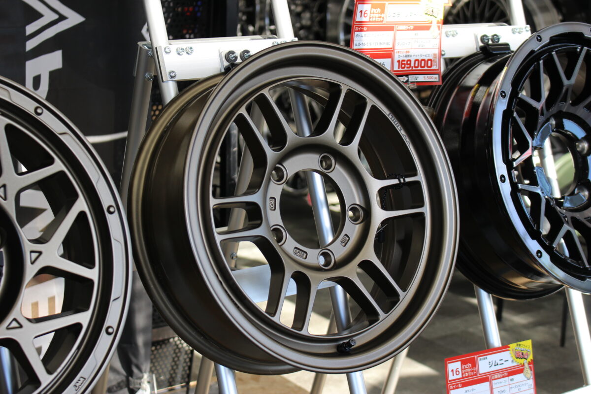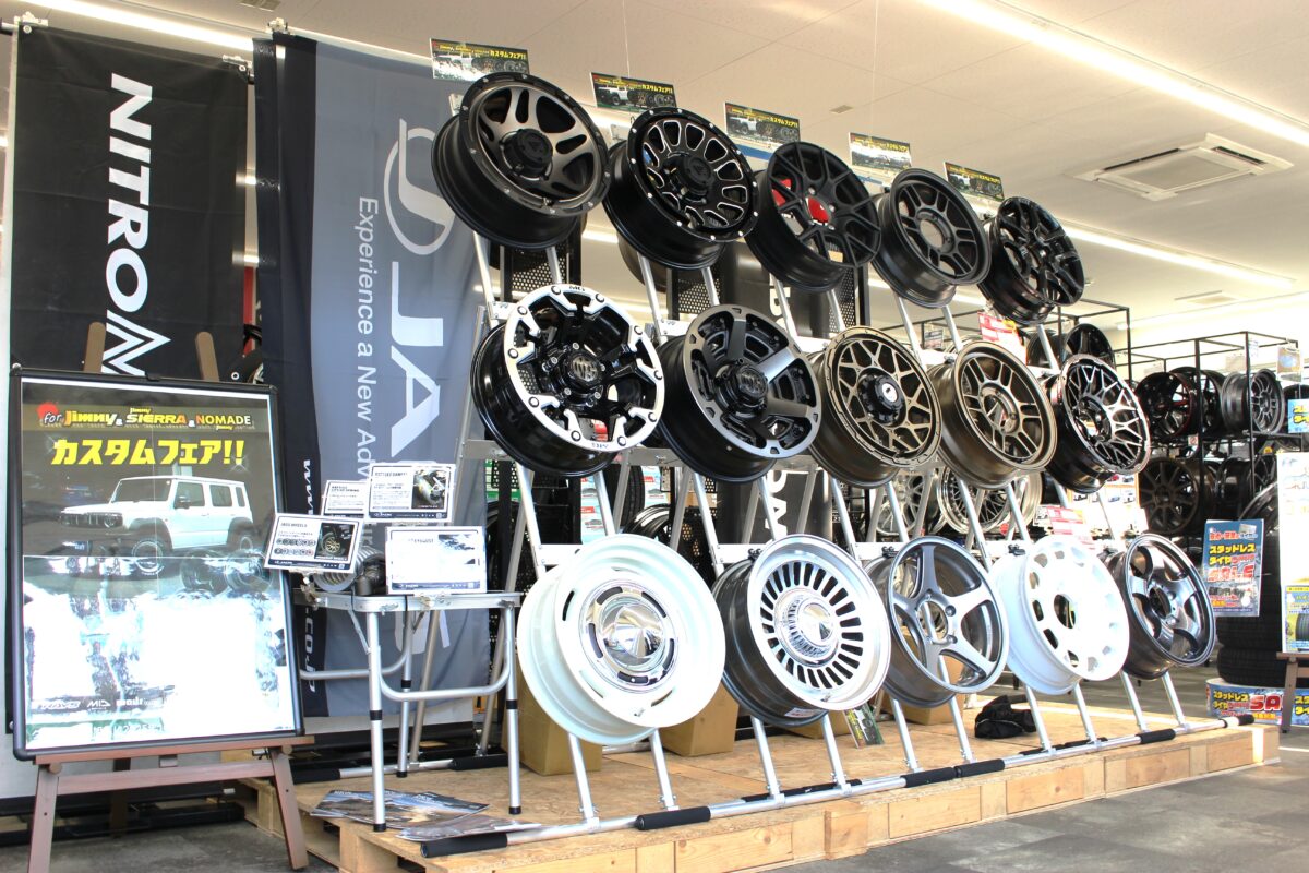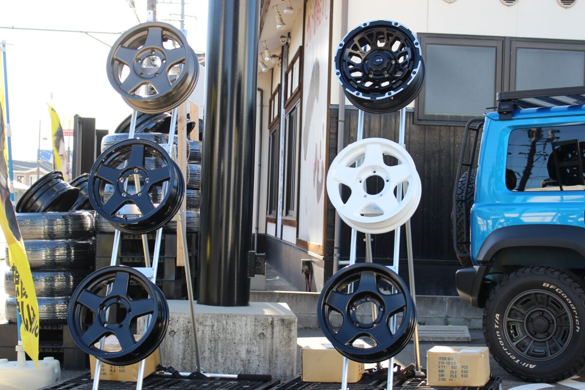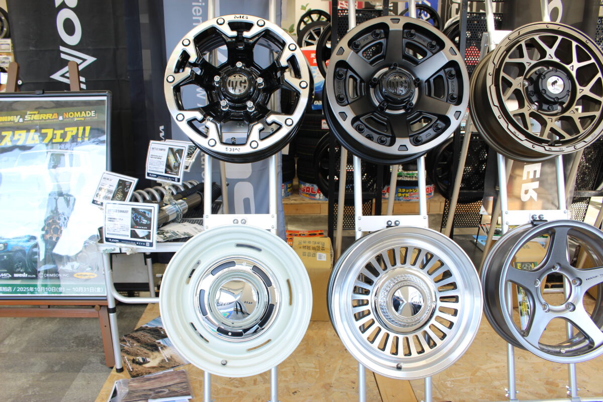 ジムニー・シエラ・ノマド用のホイールを大量展示。