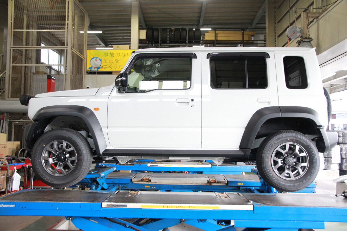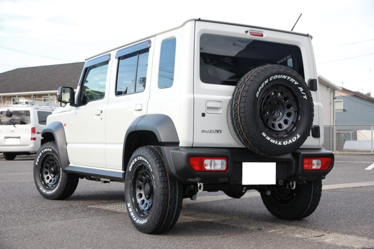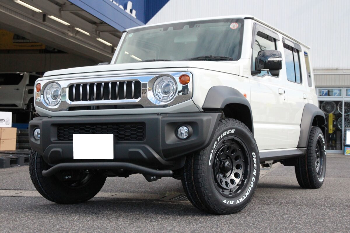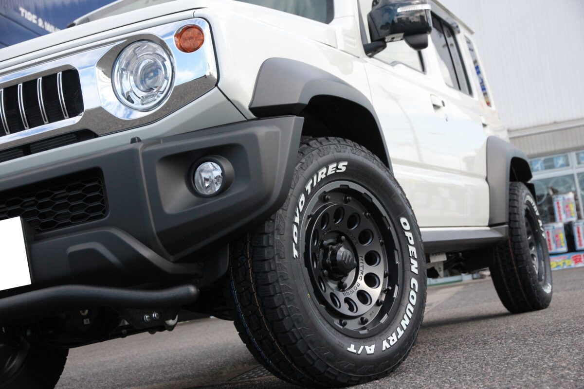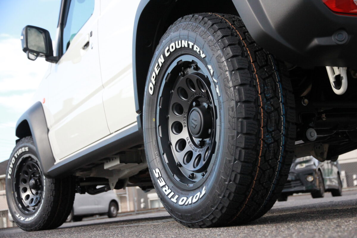 ジムニーにブロックタイヤ&ホワイトレターのタイヤを装着してカッコよく♪