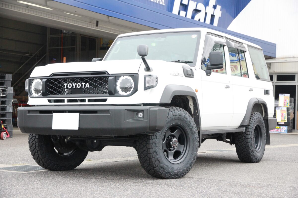 ランクル70にブラッドレーVのインセットゼロをセット!! クラフト長良店クマザキです!!   本日は最近続々と来店台数が増えております再再販ランドクルーザー70👍   再再販ランクル70と言えばワイドボディーの為インセット0が通常では専用設計で販売されている事が多い印象   チューナーサイズとしてマイナスインセットも一部あったりして出ヅラに変化を付けれます   本日はインセット0のあのホイールにて仕上げていきますよ🔥 ランドクルーザーと言えばピンとくる方もいらっしゃると思いますがブラッドレーVを装着して行きます   個人的に箱が1本箱で梱包されているのが素晴らしいと思ったのとデザインもGOOD メーカー様のコダワリを感じます 本日はタイヤを流用してのカスタムになります!!   ホイールを変えただけで印象はメチャクチャ変わりますので街乗りメインのオーナー様にオススメ 取り付けていきます 完成👍   ブラッドレーVの数あるカラーの中からホワイト系のボディーと非常に相性のいいマットブロンズをセット   個人的にこのカラー大好きなんです インセットゼロで仕上げると純正プラスアルファになりイイ感じに 刺激を求めたい皆様には是非チューナーサイズに挑戦して下さい オーナー様この度はご来店有難う御座いました!!   またのカスタム是非お待ちしております👍   ではクマザキでした