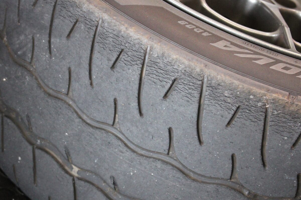 まだ溝がある状態ですが、サーキット走行では公道よりもタイヤに大きな負荷がかかりタイヤ温度が上昇します。加熱と冷却を繰り返すことによってゴムが硬化することで性能が低下していきます。