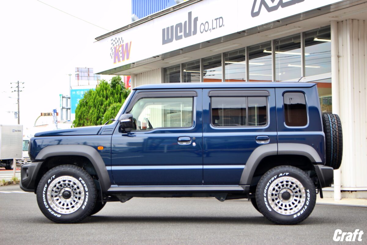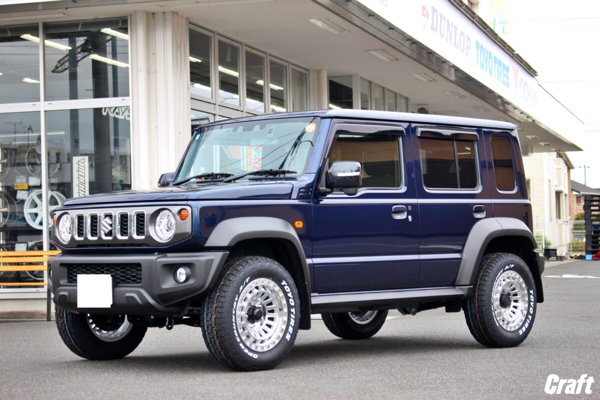 ジムニーシエラにWeds新作ホイール MUD VANCE SD装着! ブラックのボディカラーに艶無しのマットブラックカラーのホイールでシックなカラーリングにまとめ、ホワイトレターのタイヤを履かせることで白黒の明暗がはっきりして目を引く仕様にカスタム! ジムニーのカスタムもクラフト尾張旭店にお任せください♪ 皆様こんにちは、クラフト尾張旭店です。 ジムニーシエラにWeds 新作ホイールであるマッドヴァンス SDとオフロードカスタムのタイヤといえば、人気筆頭であるオープンカントリーA/T Ⅲを装着しましたので、こちらのカスタム紹介をさせていただきます。 納車前にクラフトのブログを見ていただきホイールのカスタムをご用命いただきました。 納車日にご来店のご予約をお受けしたので、納車直後にタイヤ・ホイールカスタムです! ホイールによっては納期が長い場合もございますので、納車直後のカスタムをご希望の際は事前にご注文いただけますと納車に合わせてカスタム可能となっております。 今回装着するものはコチラ↓↓↓ 【MUD VANCE SD】 細めなスポークデザインがスポーティな印象を受けますが、スポークがリムまで伸びているリムオーバーデザインを採用しているので、ホイールの大口径感が演出できます。 艶無しのマットカラーになりますが、ザラザラ感を抑えているような質感になりますので、無骨になりすぎずスタイリッシュに仕上げれますよ👌 【OPEN COUNTRY A/T Ⅲ】 オンロードもオフロードもどちらもご使用いただけるオールテレーンタイヤ。 どんな気候でも使用することができる優れモノのA/Tタイヤはオフロードカスタムされる方でゴツゴツした見た目で性能も良いタイヤを求められる方にとってとても人気なタイヤですね👀 A/Tタイヤの中でも特に人気なオープンカントリーA/T Ⅲはジムニーシエラのサイズでは文字全体がホワイトレターとブラックレターの設定がございますので、今回はホワイトレターを選択いただきました。 作業中の写真になりますが、F:カスタム後 R:純正の比較になります。 外径が純正よりも大きくなり、サイドウォールはホワイトレターでしっかりオフロード仕様にできているのがお分かりかと思います。 それでは、カスタム前とカスタム後をご覧ください。 【Before】 【After】 ■SPEC Wheel: MUD VANCE SD SIZE:16×6.0J 5/139 COLER:FULL MAT BLACK TIRE:OPEN COUNTRY A/T Ⅲ SIZE:215/70R16 背面のスペアタイヤですが、文字が横になっているとせっかくのホワイトレターがカッコ悪く見えますよね? そのため、取り付けの際にサイドウォールの文字が写真のように配置できるように組み込みをすることで、リアビューがカッコよくなります! スペアタイヤが背面にあるジムニー系は4本交換いただく方と5本交換いただく方がいらっしゃいますが、5本変えていただくとご使用はもちろん見た目もガラッと変わって仕上がりが一段と良くなりますよ! この度はクラフト尾張旭店をご利用いただき誠にありがとうございます! これから四駆ライフを存分にお楽しみください^^ お近くにいらした際は空気圧点検などお気軽にお越しくださいね♪ またのご利用お待ちしております。     ~開催予定イベント~ 管理番号:1182508241003