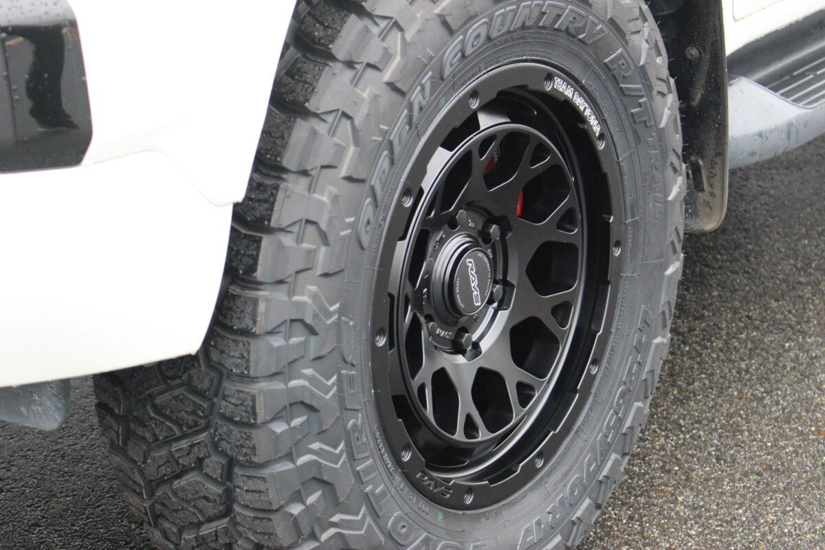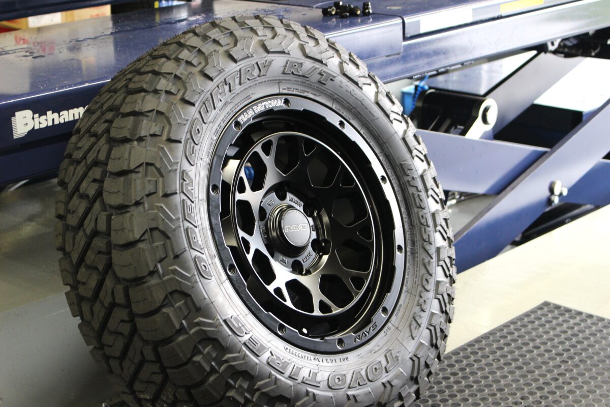 ノーマル車高では厳しいサイズでもリフトアップをすることによって装着が実現。