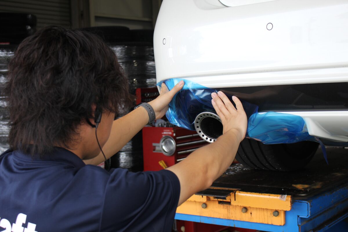 万が一にもボディに傷がつかないよう、しっかりと養生を施して作業スタートです!!