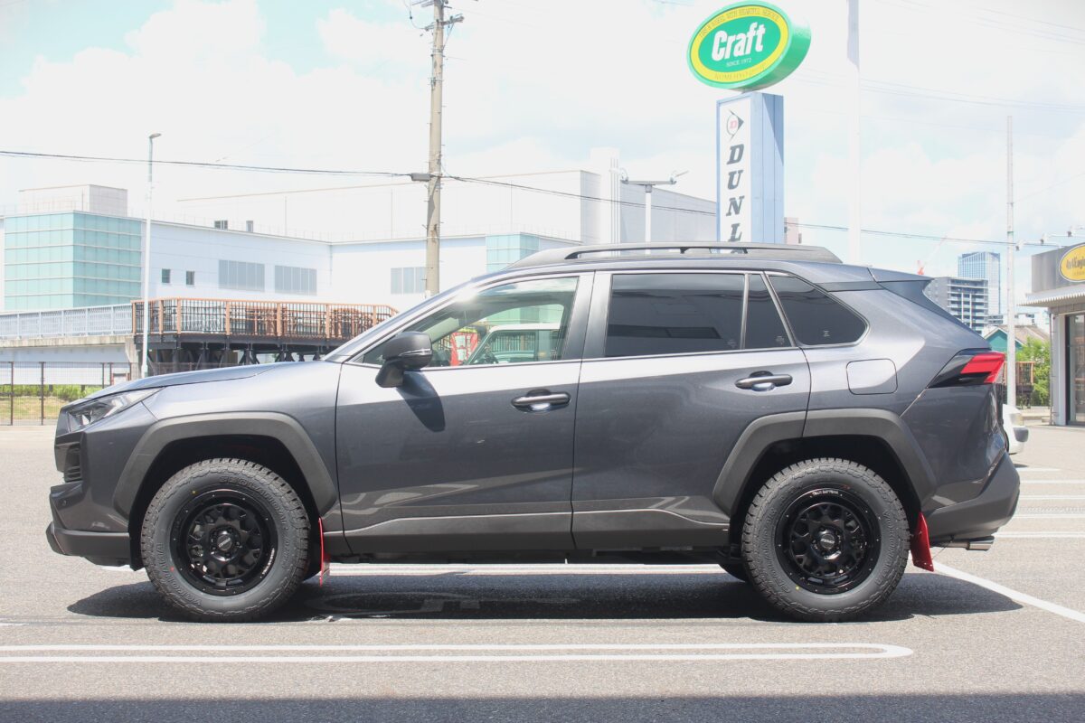 RAV4に太履き265/65-17を装着!! 出ヅラはどんな感じに仕上がる???   いつもありがとうございます!!クラフト厚木店・のりかずです。   本日のご紹介はI様・RAV4。   タイヤ・ホイール交換に加えリフトアップも一緒に施工していきます!     まずはこちら、入庫前のRAV4です。   今回のRAV4は「アドベンチャーオフロードパッケージ」というグレード。   RAV4に乗っている方なら知っているかもしれませんが、ほかグレードよりも10mm程車高が高いグレードになりますね。   そして今回取り付けたリフトアップアイテムは「ACC イージアップ1.5インチキット」、約38mm車高が上がるアイテムとなります。   38mm+10mmで48mmってことは約2インチ近く上がることになりますね♪     そして今回取り付けていくタイヤホイールがこちら   ホイール:RAYS デイトナM9+ 7.0J-17インチ   タイヤ:ヨコハマ ジオランダーAT4 G018 265/65-17   RAV4では245/65-17をよくご注文いただきますが、今回はもうワンサイズアップの265/65-17をチョイス。   外径が更に大きくなるのでリフトアップを行っている車軸なら、バランスはいい感じです✨✨     265/65-17となるとタイヤの存在感がすごいですよね👍   ちなみに外径の差となると直径で約49mm、半径で約24mmとなっています。   今回のリフトアップと合わせると約72mm(3インチ)になりますよ(笑)       見比べてみるとだいぶ変わっていますよね👍   ちなみに「265/65-17を装着したい!けど干渉問題はどうなの?」とよくご相談を頂くことが多いです。   しかし、ホイールサイズによってかなり変わるのでその都度ご相談くださいね♪     そして最後に出ヅラです!   いい感じの出ヅラに仕上がってくれていますよ!   RAV4でもツライチにしたいって方は265/65-17を検討してみてはいかがでしょうか!   注意事項等もありますので、店頭で聞いてみてくださいね♪   それではご相談お待ちしております!!     I様この度はクラフトをご利用いただきありがとうございました!!   ホイールの入荷にかなりお時間をいただいてしまい申し訳ございませんでした。。。。💦   265/65-17の迫力すごかったですよね!   そして何より72mmの車高の変化は驚きではないでしょうか!   また、ぜひクラフトをご利用ください!!   管理番号:0412510051001