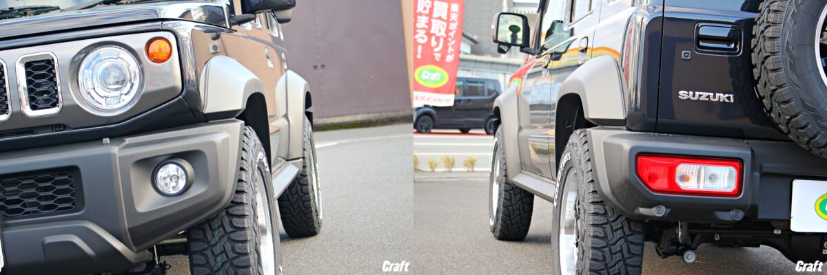 突出していないから保安基準もクリア。。。 そしてフロントバンパー小加工で干渉対策もOKですよぉ~ 👍     いつもありがとうございます、クラフト厚木店・佐藤です!!   本日のご紹介はS様・ジムニーノマド。   納車ラッシュ?? となっているのか、ここ最近ジムニーノマドでのご相談が増えている当店。   そんなノマドをホワイトレタータイヤを使ってカッコ良く仕上げましたよぉ~✨     ご購入いただいたホイールは 「 RAYS A・LAP-J 」 16インチ。   コチラのホイールはRAYSさん得意の ” 軽量鍛造 ” ホイール!!   おそらくジムニーシエラ・ノマド用のホイールでは最軽量??だと思われる、めっちゃ軽いホイールとなりますっ✨   そして、シエラやノマドオーナー様から良く聞くのが 「 走った感じがちょっと重たい 」 と言うお悩み。。。   軽自動車のジムニーとはエンジンも違い、排気量は 1500cc となっている K15B エンジン。   この車格で言えば 1500cc と言うのは妥当な気もしますが、皆様が感じている 重たい感じ はどこからきているのでしょうか!?     まず1つ考えられるのはアクセル開度を調整するスロットルにあるかと思います。   今までのジムニーやシエラ・ノマドはアクセル開度の調整(スロットル)が ” ワイヤー式 ” となっていました。   ですが、現行のジムニーやジムニーシエラ・ノマドはアクセル開度を電子制御する 「 電子スロットル 」 に変更されています。   ワイヤー式の場合はアクセルを踏んだ分がダイレクトに反映されていましたが、電子スロットルの場合 「 アクセルの踏み込み量=アクセル開度 」 ではなくなっているんですよね。。。   それにより ” アクセルを踏み込んでいるのに思っている加速をしてくれない ” っと言う感覚になってしまい、その感覚のズレが走りが重たく感じると言う症状につながってしまうのだと思います。   そうした背景には燃費性能の向上を図るなどの理由があったのではないかと思いますが、そんなクルマの特性を物理的に改善するのに効果的なのが 「 軽いホイールを履く事 」 なんですよねっ 👍   例えばボク達人間に例えると。。。 重たい荷物を背負って歩くのと手ぶらで歩くのとでは疲労感が違いますよね??   クルマでもそれは同じ事で、クルマ自体が軽くなれば走りも少し軽快になると言う訳です!!   そう言った意味では RAYS A・LAP-J はRAYSさんが得意とする 「 鍛造ホイール 」 となり、かなりの軽量ホイール。   間違いなく走りに違いが出る事でしょう 👍     なんだかうんちくが長くなってしまいましたが。。。   S様・ジムニーノマドはタイヤも少し太めのタイヤを装着したんですよぉ~✨   本日装着しているタイヤは 「 トーヨータイヤ オープンカントリーRT 」 となり、タイヤサイズは 225/70-16 となります!!     ですが、ノーマル車高のジムニーノマドには決して推奨サイズとは言えないタイヤサイズでもあるんです。。。   その理由はタイヤとボディーが干渉してしまうからです。   ちなみに、本日ご紹介のS様・ジムニーノマドもノーマル車高となります。   それでは次の画像をチェックしてみましょう!!     赤い丸で囲ってある部分ですが、現状では干渉はしていません。   ですが、この状態からハンドルをいっぱいに切り込んでいくと。。。 👀     このようにバンパー下部とタイヤが干渉してしまうんですよね。。。汗   撮影は静止状態で行っていますが、この状況で走行すると凹凸のあるタイヤとバンパー下部がこすれ合うので、なかなか刺激的な音が発生しそうですよね。   ですが、この干渉部位に少し手を加えてあげる事でクリアランスを確保する事も出来るんです!!     いかがでしょう、さっきまでバンパー下部と干渉していたタイヤですが、クリアランスが確保出来ていますよね!? 👀   もともと干渉している部分は軽微な干渉でしたので、この状態なら普通に乗れそうですよね。   ですが、オフロード走行をすると考えた場合はリフトアップや更なる対策が必要となるでしょう。   本日装着のタイヤサイズ&干渉対策は 「 ドレスアップを目的としたカスタムの場合 」 と考えていただければ良いかと思います ✋     そして干渉問題とは別に、もう1つ気にしてあげないといけないポイントがあるんですよね。   それはボディーからの突出問題です!!   ジムニーシエラやノマド用ホイールのインセットですが 「 -5 」 と言うサイズが多いのではないかと思います。   ですが、このインセットの場合 225/70-16 を装着するとタイヤ側面がボディーから突出してしまう可能性があるんです。   今までのデータでは ” 215/70-16 ” と言うジムニーシエラ・ノマドの定番サイズでも若干の突出が発生する事もあったんですよね。   しかしながら、現状の保安基準では 「 タイヤなら片側9mmまでの突出はOK 」 とされています。   そう言った意味では -5 のインセットのホイールを装着する場合は 215/70-16 までのサイズであればが安心して装着出