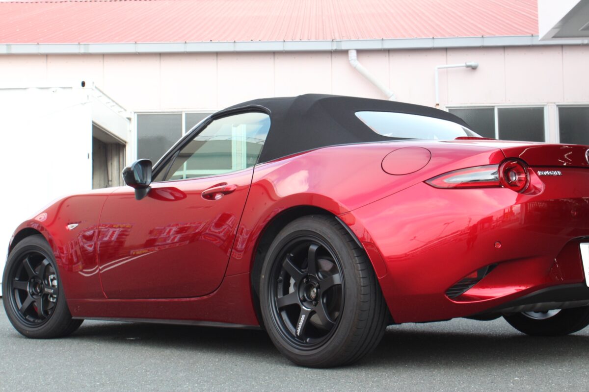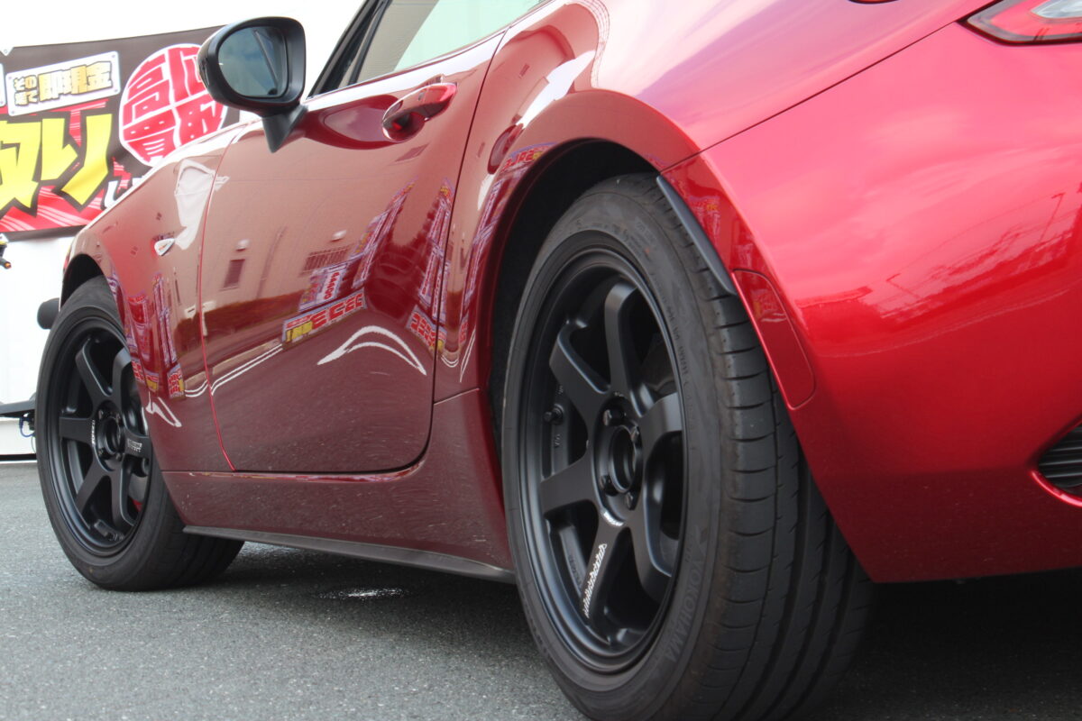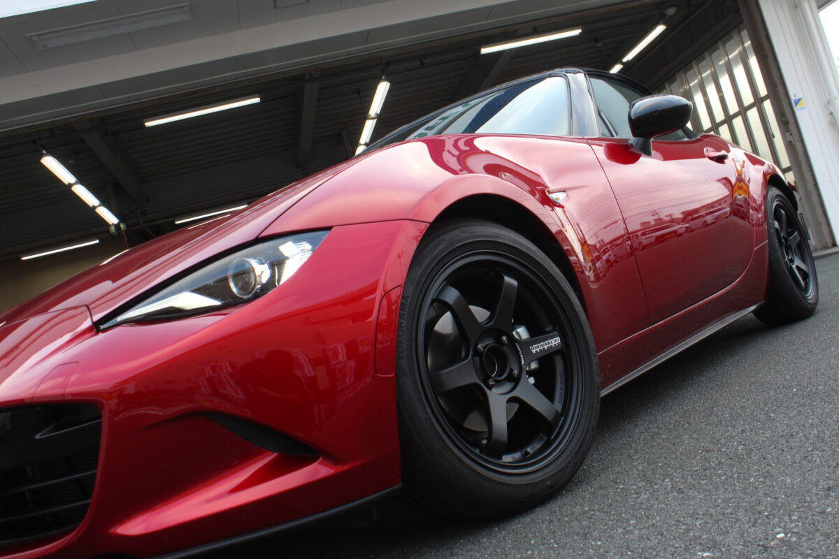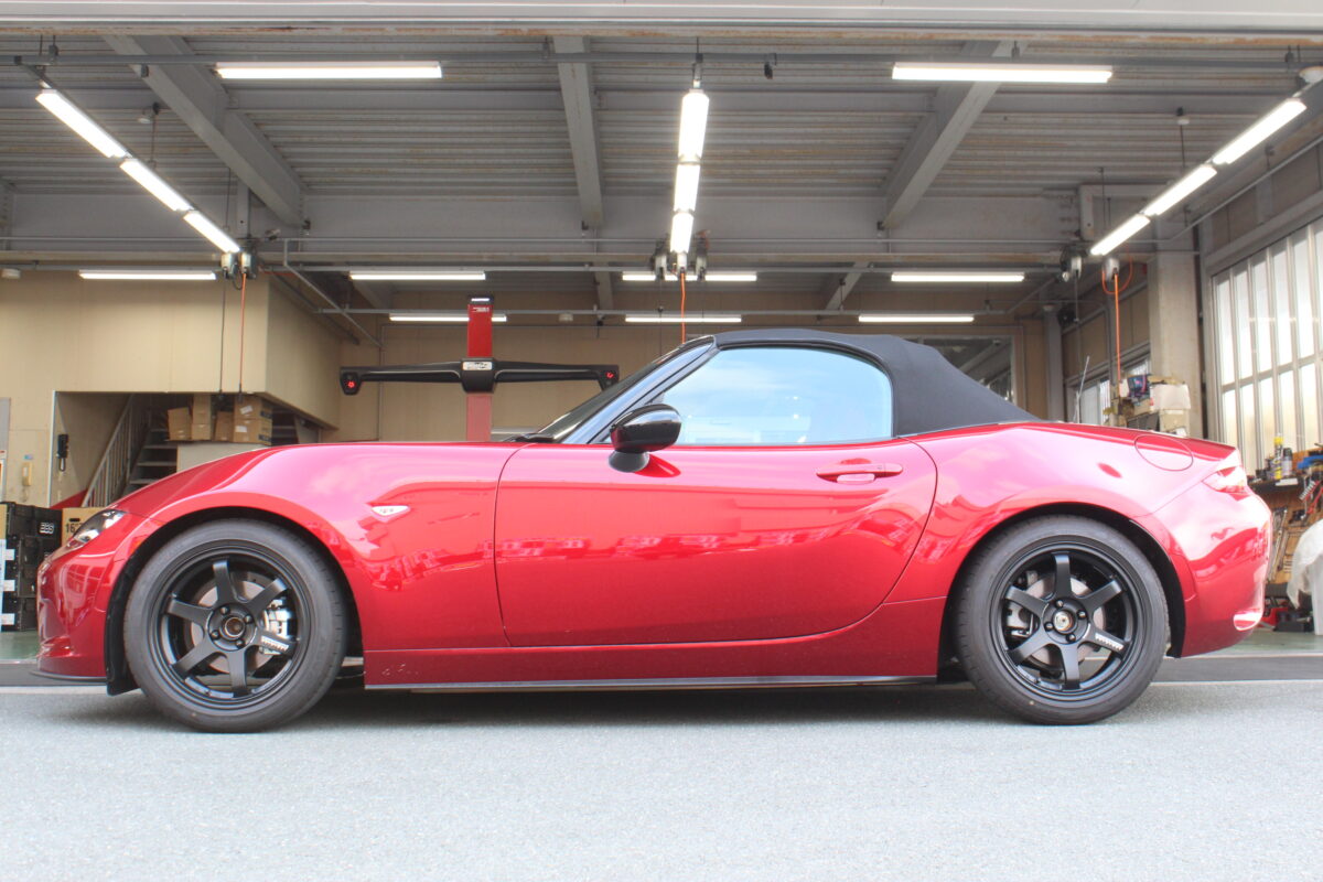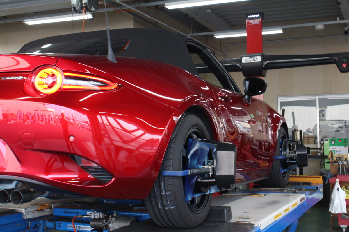 ホイール交換に伴いアライメント作業をご用命いただきました調整箇所の多いロードスターですので定期的なアライメント調整がおすすめ