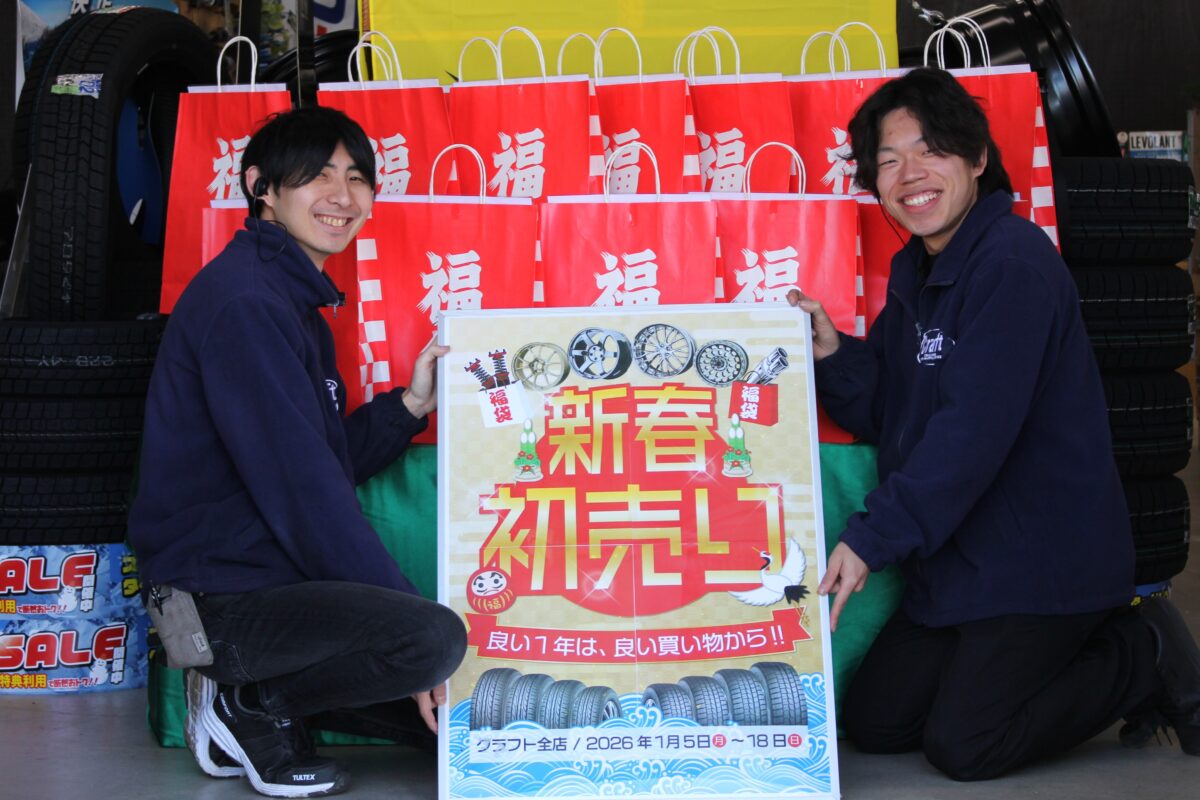 ■クラフト全店にて12月30日~1月4日までお休みを頂きます。   2026年1月5日から開催します!!新春初売りセール!!!   対象アイテムはタイヤや車高調・マフラーとカスタムパーツが対象となっていますよ~♪   良い1年はいい買い物から!!ってことでお買い得な商品もご準備しておりますので沢山のご来店お待ちしております♪   ■新春企画【1】 タイヤがコミコミ価格で安い!!   ■新春企画【2】車高調をスペシャル価格で販売!!   人気メーカーの車高調を通常割引よりも更に割引率を上げて販売します!!   新年早々ローダウンやリフトアップを検討中のお客様はチャンスです!!   対象の車高調は以下の通り🔥 ・BLITZ ダンパーZZR ・HKS ハイパーマックスS ・TEIN RX1 ・TANABE GT FUNTORIDE Dumper  ・4x4エンジニアリングサービス カンサスキット   ※クラフトで施工ができない車種がございます。 ※取付なしのお持ち帰りは行っておりません。 ※工賃・アライメント料は別途必要です。   ■新春企画【3】早い者勝ち!在庫アウトレットサスペンション大放出!!   展示商品や在庫商品を初売り特価で販売いたします!!   愛車に適合した在庫商品があれば超超お買い得となるセール!!   ちなみにクラフト全店で開催しているので、売り切れの場合はご了承くださいね!!   ■新春企画【4】新春セール限定!マフラーをスペシャル価格で大売出し!   人気メーカーのマフラーが通常よりも割引率アップとお得になります!!   対象メーカーは以下の通り🔥 ・HKSマフラー全品 (VIITSマフラー・フロントパイプ単品・センターパイプ単品を除く) ・BLITZマフラー NURシリーズ全品(NUR-SPEC VSR / NUR-SPEC VS 国産車用のみが対象) ・柿本改マフラー(競技用・NSX用を除く) ・FUJITSUBOマフラー(スーパーチタン・チタンを除く) ・JAOSマフラー   ※クラフトで施工できない車種がございます。 ※取付なしのお持ち帰りは行っておりません。 ※工賃が別途必要です。   ■新春企画【5】売り切れ御免!在庫アウトレットタイヤ大放出!   展示などで使っていたスポーツタイヤやオフロードタイヤ、そしてスタッドレスタイヤをアウトレット価格で販売します!!   気になっていたあのタイヤが安く手に入るチャンスかも!??     それでは新年1月5日から沢山のご来店お待ちしております!!