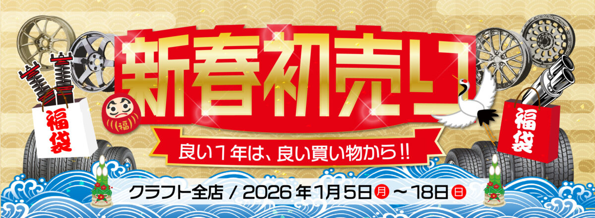 続きを読む■クラフト全店にて12月30日~1月4日までお休みを頂きます。 2026年1月5日から開催します!!新春初売りセール!!! 対象アイテムはタイヤや車高調・マフラーとカスタムパーツが対象となっていますよ~♪ 良い1年はいい買い物から!!ってことでお買い得な商品もご準備しておりますので沢山のご来店お待ちしております♪ ■新春企画【1】 タイヤがコミコミ価格で安い!! ■新春企画【2】車高調をスペシャル価格で販売!! 人気メーカーの車高調を通常割引よりも更に割引率を上げて販売します!! 新年早々ローダウンやリフトアップを検討中のお客様はチャンスです!! 対象の車高調は以下の通り🔥 ・BLITZ ダンパーZZR ・HKS ハイパーマックスS ・TEIN RX1 ・TANABE GT FUNTORIDE Dumper ・4x4エンジニアリングサービス カンサスキット ※クラフトで施工ができない車種がございます。 ※取付なしのお持ち帰りは行っておりません。 ※工賃・アライメント料は別途必要です。 ■新春企画【3】早い者勝ち!在庫アウトレットサスペンション大放出!! 展示商品や在庫商品を初売り特価で販売いたします!! 愛車に適合した在庫商品があれば超超お買い得となるセール!! ちなみにクラフト全店で開催しているので、売り切れの場合はご了承くださいね!! ■新春企画【4】新春セール限定!マフラーをスペシャル価格で大売出し! 人気メーカーのマフラーが通常よりも割引率アップとお得になります!! 対象メーカーは以下の通り🔥 ・HKSマフラー全品 (VIITSマフラー・フロントパイプ単品・センターパイプ単品を除く) ・BLITZマフラー NURシリーズ全品(NUR-SPEC VSR / NUR-SPEC VS 国産車用のみが対象) ・柿本改マフラー(競技用・NSX用を除く) ・FUJITSUBOマフラー(スーパーチタン・チタンを除く) ・JAOSマフラー ※クラフトで施工できない車種がございます。 ※取付なしのお持ち帰りは行っておりません。 ※工賃が別途必要です。 ■新春企画【5】売り切れ御免!在庫アウトレットタイヤ大放出! 展示などで使っていたスポーツタイヤやオフロードタイヤ、そしてスタッドレスタイヤをアウトレット価格で販売します!! 気になっていたあのタイヤが安く手に入るチャンスかも!?? それでは新年1月5日から沢山のご来店お待ちしております!!