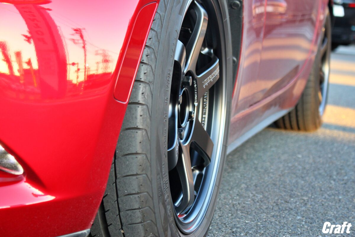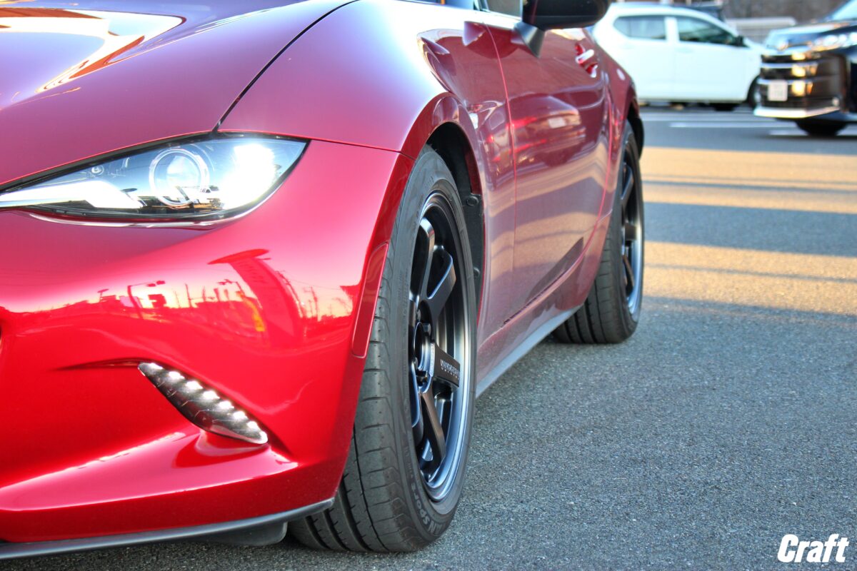 いつもありがとうございます!!クラフト厚木店・のりかずです。   本日ご紹介するのはY様・NDロードスター。   以前、当店で車高調の取り付けをさせていただき、今回はタイヤ・ホイールの交換!! ※車高調の取り付けをしたブログはこちらから↓ 【NDロードスター】30~35mm程のローダウンはこんな感じに仕上がりますよ~   やっと入荷してきたあのホイール。NDロードスターに大人気なホイールを取り付けていきます!     ご注文いただいたホイールは「レイズ グラムライツ 57トランセンド」   クラフトで多く取り付け事例があるこのホイール。   デザインがかっこよく、なんといってもコンケイブが深い!!これが欲しくなる理由1つではないでしょうか!   また、出ヅラもパツパツのツライチ!かっこよすぎます。。。     出ヅラはこんな感じ↑   以前、車高調を取り付けた際にセッティングは完了しているので、本日はタイヤ・ホイールの交換のみで完了!   にしても出ヅラいい感じですね~   あいにくの雨で少し見づらい気もしますが、「水も滴るいい出ヅラ」という事で許してください(笑)     前から見る出ヅラも良きです✨   今回のタイヤサイズは205/40-17、引っ張り仕様での仕上がりです!     実は57トランセンドって廃盤になる予定だったのが人気がありすぎて今も何とか続いているモデルなんですよね。   なので急に廃盤になる可能性があるので気になっている方早めにご相談くださいね~     Y様・この度はクラフトをご利用いただきありがとうございました!!   ホイールの入荷が思っていたよりも早く入ってきてくれてよかったです!   コンケイブ・出ヅラはいかがだったでしょうか!   見惚れてしまったのではないでしょうか(笑)   また、クラフトをご利用くださいね♪   管理番号:0412508101002