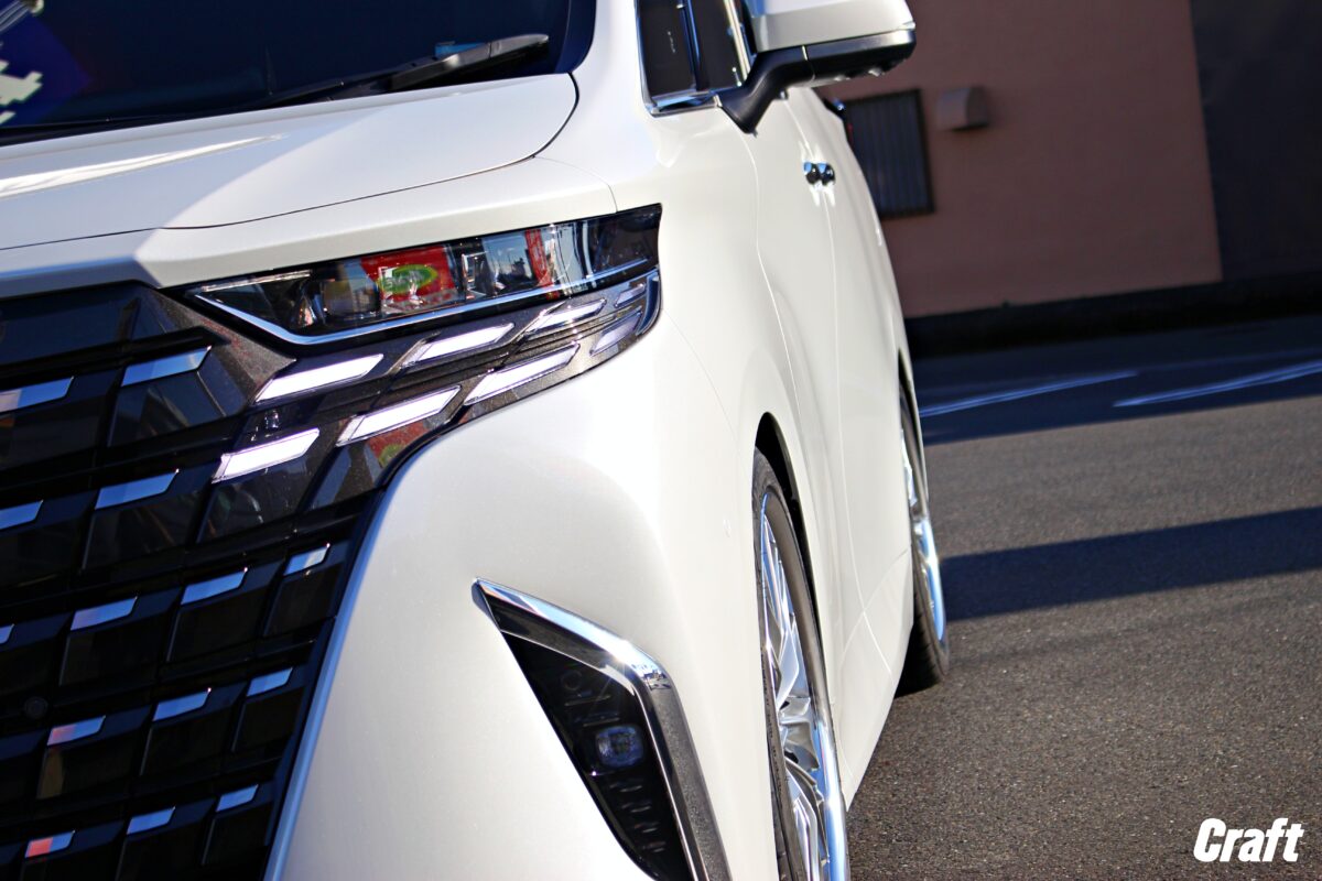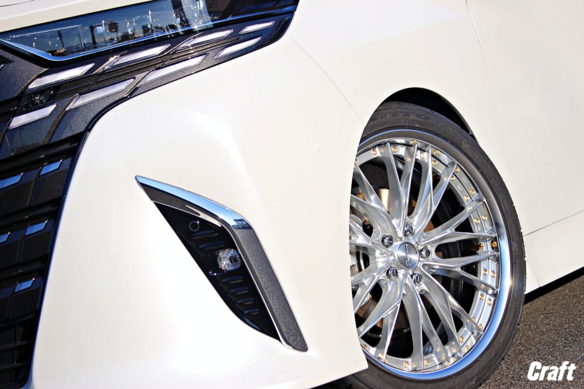ノーマル時はタイヤとフェンダーのクリアランスが広く、少し浮いているように見えたアルファード。