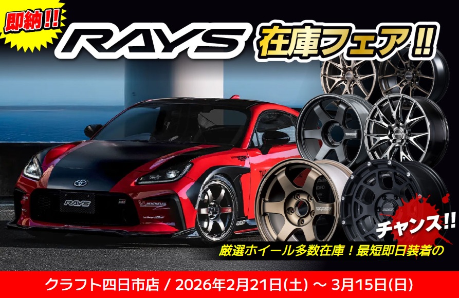 皆様こんにちは! まだ寒い日が続いていますが冬が終われば春の履き替えシーズンに入ります。 「暖かくなったらあのホイールを履いてドライブしたい!」 「夏タイヤを交換するタイミングでホイールも交換したい」とお考えの方も多いと思います。 しかし! そう思って今から注文してもホイールによっては納期がかかるものがあります>_< 長いものだと「納期3ヶ月〜未定」などで春が終わってしまうことも珍しくありません… そこでクラフト四日市店は「欲しいその瞬間に履ける喜び」を提供するためRAYSの人気モデルを確保しました! ※写真はイメージです。 特にスポーツカーオーナー様から人気の高いボルクレーシングやグラムライツ。 ゴールデンウィークのドライブや走行会などまでに交換したいという方も多いのではないでしょうか? ※写真はイメージです。 ミニバンやSUVオーナー様からはホムラやチームデイトナシリーズが人気ですね。 納車後すぐにカスタムしたいという皆様、チャンスですよ^^ 今回のイベントではカタログやWebの画像では絶対に伝わらない「リアルな質感」と「造形美」を確認いただけるよう普段展示していないホイールをRAYSさんからサンプルをお借りして展示します! そして、イベント期間中のご成約は特典もご準備しております♪ 「欲しい」と思った時が一番熱い時。 その熱量を無駄にせず最高の状態で春のドライブへ出かけていただきたい、そんな想いで準備した特別な期間です。 「今から頼んで間に合うかな?」 「実物の色味を自分の目で確かめたい」そんな皆様、ぜひクラフト四日市店へ足をお運びください。 「即納在庫」があなたの愛車を最速で格上げします! 『RAYS即納・在庫フェア!厳選在庫品特別商談会!!』の開催期間は2026年2月21日(土)~3月15日(日)です。 詳細はブログで随時アップしていきますのでお楽しみに! 皆様のご来店、お問い合わせお待ちしております。