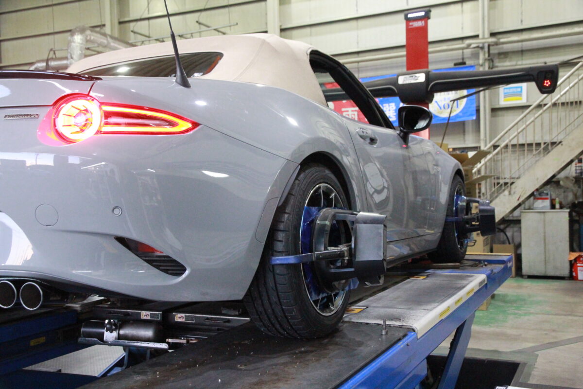 ロードスターの調整ヵ所はフロントがトゥ・キャンバー・キャスター、リアがトゥ・キャンバーの計5か所!