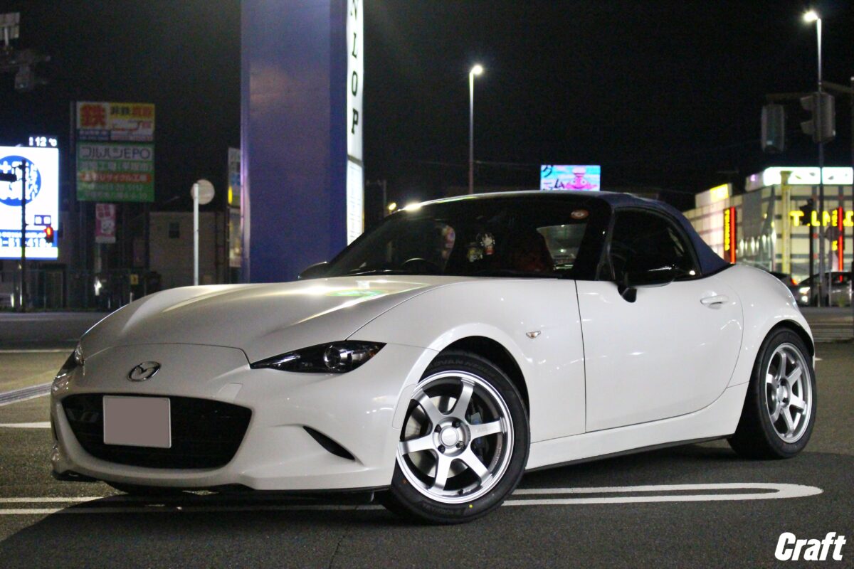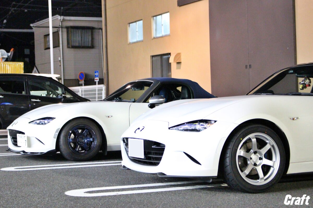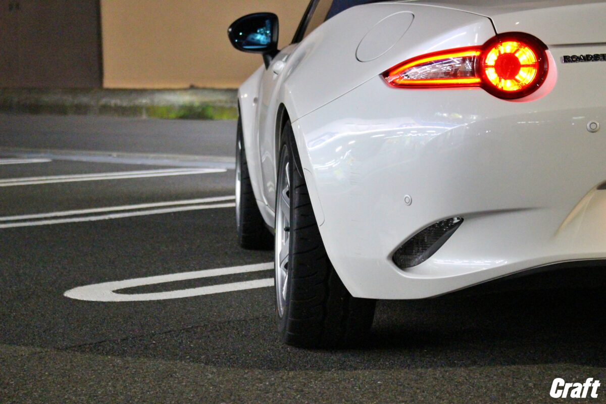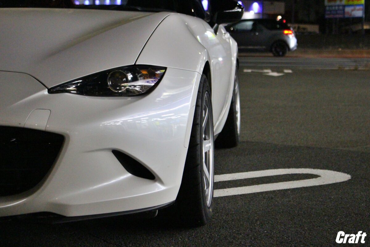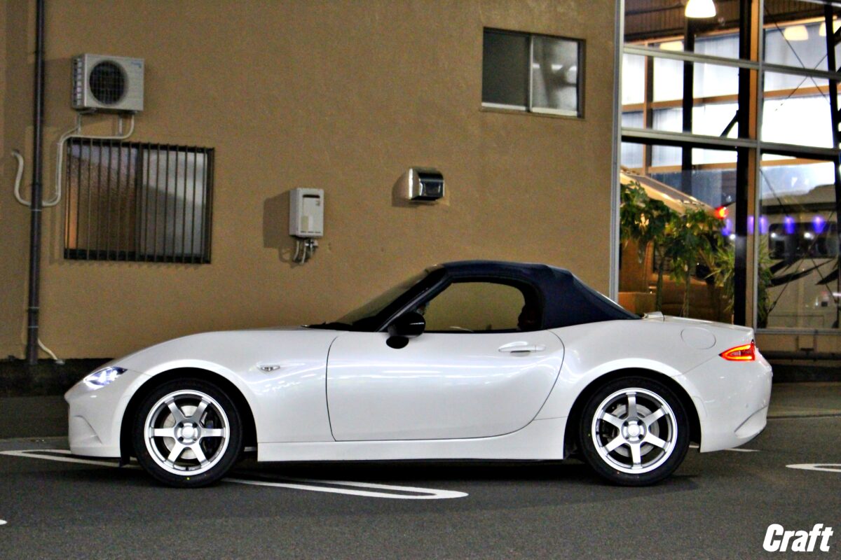 K様のNDロードスターは入庫時にはすでに車高調ローダウンを済まされておりましたので、クラフトではキャンバー角などの見直しをさせていただきました。