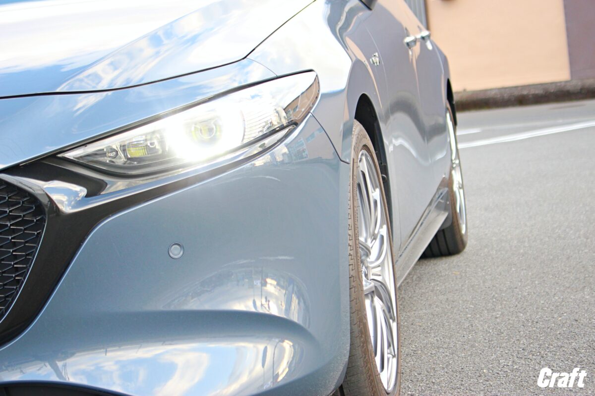 本日ご紹介のマツダ3は車高調を装着しローダウンを行っている車輛。