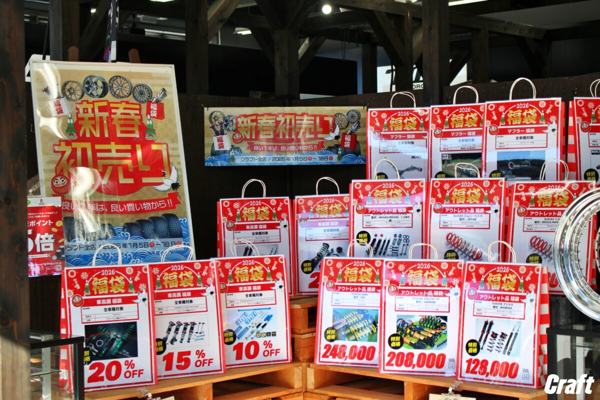 ■クラフト全店にて12月30日~1月4日までお休みを頂きます。   2026年1月5日から開催します!!新春初売りセール!!!   対象アイテムはタイヤや車高調・マフラーとカスタムパーツが対象となっていますよ~♪   良い1年はいい買い物から!!ってことでお買い得な商品もご準備しておりますので沢山のご来店お待ちしております♪   ■新春企画【1】 タイヤがコミコミ価格で安い!!   ■新春企画【2】車高調をスペシャル価格で販売!!   人気メーカーの車高調を通常割引よりも更に割引率を上げて販売します!!   新年早々ローダウンやリフトアップを検討中のお客様はチャンスです!!   対象の車高調は以下の通り🔥 ・BLITZ ダンパーZZR ・HKS ハイパーマックスS ・TEIN RX1 ・TANABE GT FUNTORIDE Dumper  ・4x4エンジニアリングサービス カンサスキット   ※クラフトで施工ができない車種がございます。 ※取付なしのお持ち帰りは行っておりません。 ※工賃・アライメント料は別途必要です。   ■新春企画【3】早い者勝ち!在庫アウトレットサスペンション大放出!!   展示商品や在庫商品を初売り特価で販売いたします!!   愛車に適合した在庫商品があれば超超お買い得となるセール!!   ちなみにクラフト全店で開催しているので、売り切れの場合はご了承くださいね!!   ■新春企画【4】新春セール限定!マフラーをスペシャル価格で大売出し!   人気メーカーのマフラーが通常よりも割引率アップとお得になります!!   対象メーカーは以下の通り🔥 ・HKSマフラー全品 (VIITSマフラー・フロントパイプ単品・センターパイプ単品を除く) ・BLITZマフラー NURシリーズ全品(NUR-SPEC VSR / NUR-SPEC VS 国産車用のみが対象) ・柿本改マフラー(競技用・NSX用を除く) ・FUJITSUBOマフラー(スーパーチタン・チタンを除く) ・JAOSマフラー   ※クラフトで施工できない車種がございます。 ※取付なしのお持ち帰りは行っておりません。 ※工賃が別途必要です。   ■新春企画【5】売り切れ御免!在庫アウトレットタイヤ大放出!   展示などで使っていたスポーツタイヤやオフロードタイヤ、そしてスタッドレスタイヤをアウトレット価格で販売します!!   気になっていたあのタイヤが安く手に入るチャンスかも!??     それでは新年1月5日から沢山のご来店お待ちしております!!