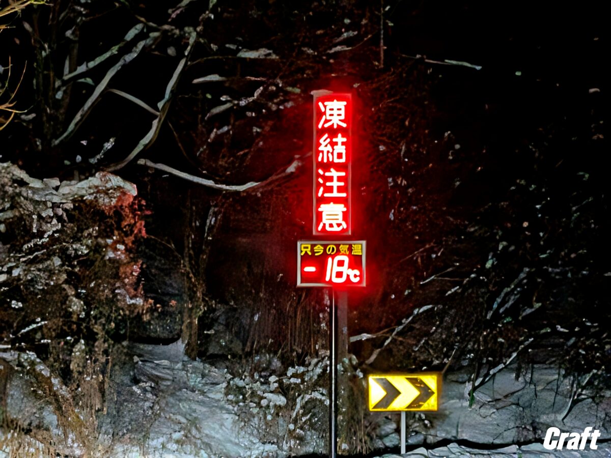 スタート時の気温はマイナス7℃。 路側の電光掲示板には 「 この先スタック多発 注意 」 という、緊張感を煽る案内が表示されています。