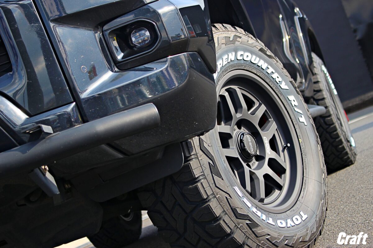 ワイドフェンダーを装着しているなら、それに見合ったホイールサイズがオススメ!! 本日は出ヅラにも拘り 「 RAYS DAYTONA M8 」 で仕上げましたよ~✨     いつもありがとうございます、クラフト厚木店・佐藤です!!   本日のご紹介はA様・HILUX GRスポーツ。   すでにリフトアップスプリングで前下がりを補正しており、ホイール交換を行う準備はバッチリ!!   そんな訳でタイヤサイズ&ホイールインセットを厳選し仕上げましたよぉ~♬♬     ご購入いただいたホイールは 「 RAYS TEAM DAYTONA M8 」   通常のM8とは違う特殊なカラーで仕上げられている M8 xB Edition 。   本日装着しているのは セミグロスアームズグレー / E-pro Coat(G4L) となります!!     RAYS DAYTONAシリーズには様々なデザインが用意されていますが、このM8はちょっと攻めたサイズ設定となっているんです!!   ここで言う攻めたサイズとは 「HILUX 」 が装着するであろう17インチ 6Hの事。   従来のDAYTONAシリーズの場合、サイズ設定は 「 8.0J インセット+20 」 となっていました。   ですが本日装着の DAYTONA M8 は 「 8.5J 」 のリム幅がベースとなり、インセットも 「 +10 / ±0 」 となかなか攻めたサイズ設定になっているんです!!   ちなみに、このインセットと言うのは数字が小さくなればなるほどホイールが外にオフセットされる仕組み。     そして、インセットの数値が少ない方が最近の流行でもある コンケイブ を強調させやすくなるんです!!   こうして見てもなかなかのコンケイブスタイルとなっていますよねっ♬♬   ちなみに、この攻めたサイズでもあるM8、ナローボディーのHILUXや150プラドに装着するとどうなるのでしょうか。。。     その答えはなかなか際どい仕上がりとなります!!   150プラドに装着する場合 「 265/70-17 」 を組合わせた場合にタイヤの横っ腹がフェンダーから少し見える位の仕上がりとなります。   現状の保安基準では、タイヤの突出は一定の数値までOKとされているのでギリギリセーフでしょう。   しかしながら、HILUXの場合は貨物車(4ナンバー)となっており、タイヤでも突出してはいけないと言うルールとなっているので保安基準をクリアするのは難しいかも知れません。。。     8交点メッシュ、そしてビードロック風なデザインを採用しているDAYTONA M8。   そんなデザインを更に強調させるのが E-pro Coat にてリム部をブラックに仕上げている事!!   それによりリム部に別部品が装着されているように見えますよねっ♬♬   ちなみに、HILUXはフェンダーアーチがやや狭いおクルマ。   なので、タイヤサイズを変更するのがとても難しいんですよね。。。   A様・HILUX GRスポーツはリフトアップスプリングでリフトアップを行っておりましたが、1.5インチ程のUP量である事からタイヤサイズは 「 265/70-17 」 を選択!!   それでもインナーフェンダーとのクリアランスはゼロに等しかったんです。汗   もちろん、安心して乗っていただけるようにインナーフェンダーの1部に手を加えておきましたっ 👍     それでは最後に気になる出ヅラをチェックしてみましょう!!     なかなかキレイな出ヅラですよねっ 👍   先程も記載しましたが、HILUXはタイヤの突出も許されないおクルマ。   装着後に糸を垂らしてチェックしてみましたが問題ナシ!!   干渉対策や保安基準対策もバッチリなHILUX GRスポーツが完成しましたよぉ~✨   これから愛車のカスタムをお考えのオーナー様、クラフト厚木店にぜひお任せ下さいね~♬♬     A様、この度はご利用誠にありがとうございました!!   ご相談当初から狙っていたホイールは DAYTONA M8 でしたが、カラーでお悩みでしたよね。。。   ですが、最終的に選んでいただいた セミグロスアームズグレー(G4L) は大正解だったのではないでしょうか!?   その後、例の送り迎えでは注目の的となりましたかね??笑   それではまたのご利用よろしくお願いしま~す☆☆   管理番号:0412505011005