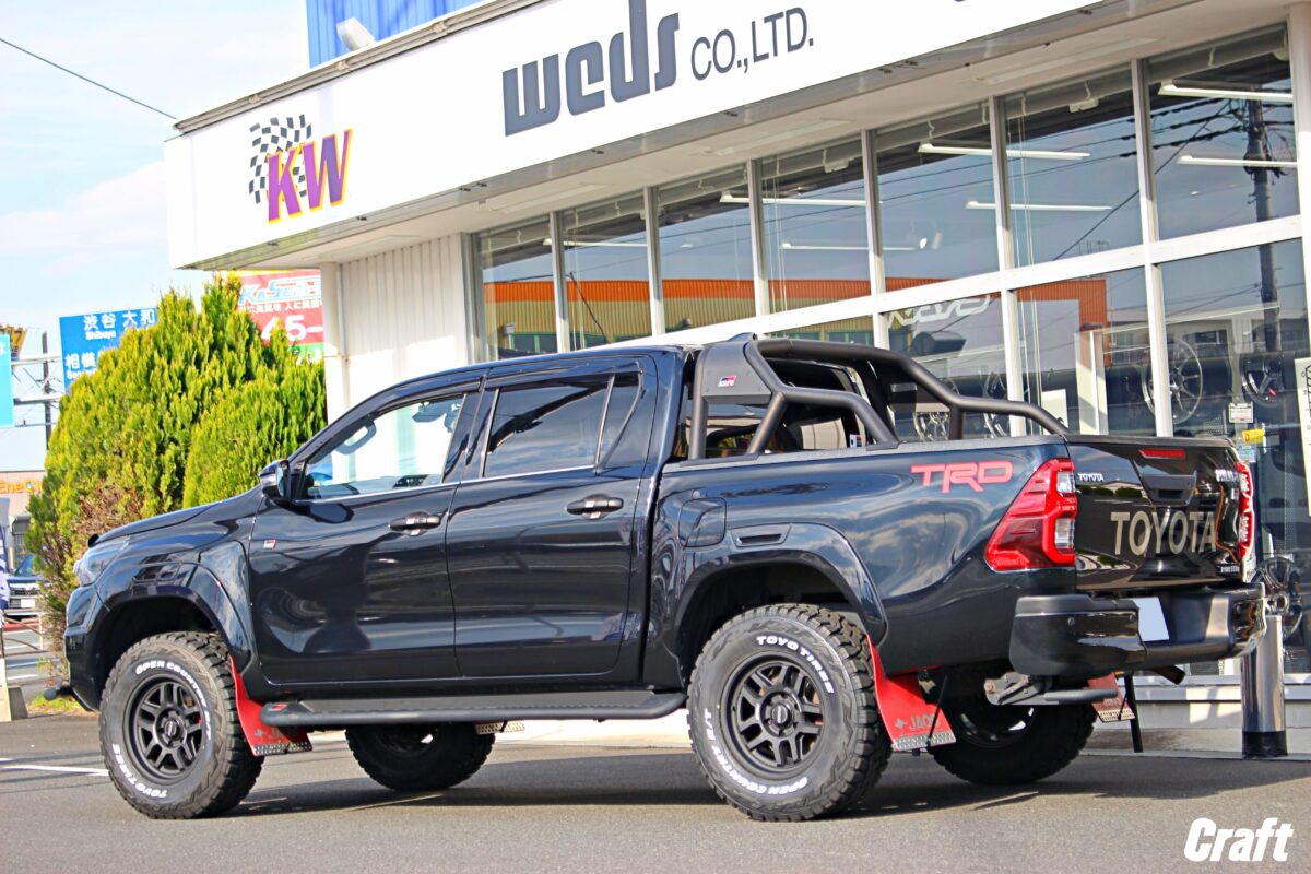 車高調整機能を上手く操ることで仕上がりも変わる!! 「 JAOS VFCA Ver.A 」 はいかがでしょうか??     いつもありがとうございます、クラフト厚木店・佐藤です!!   本日のご紹介はK様・HILUX GRスポーツ。   ノーマル車輛をお預かりし、タイヤ・ホイール交換&リフトアップ作業を行いましたよぉ~♬♬     上の画像は足廻りを交換し、仕上げのアライメント調整作業を行っている風景です。   本日装着したリフトアップアイテムは 「 JAOS BATTLEZ VFCA Ver.A 」 となります!!   JAOSさんからリリースされているHILUX向けのリフトアップアイテムは スプリング のみ、そして ショックアブソーバー&スプリング のセット があります。   本日装着した VFCA Ver.A は後者のタイプとなり、更には車高調整機能(フロント)も備わったモデルとなります。     コチラの画像が入庫時のHILUXとなります。   HILUXは前傾姿勢。。。なんて言われますがいかがでしょうか??   前後のフェンダークリアランスを比較してみると、確かにフロントのクリアランスの方が明らかに少ないですよね。   本日のカスタムではこのクリアランスのバランス、そして足元の迫力UPを求めたスタイルへと仕上げましたよっ 👍     いかがでしょう、こうして見ると前後のクリアランスが同じ位に見えるようになりましたよね!?   そこに組合わさったタイヤ・ホイールの効果もあり、迫力のHILUX GRスポーツが完成しましたっ✨     HILUXと言うクルマはタイヤ・ホイール交換をするにあたり注意する点が多いクルマでもあります!!   まず、タイヤサイズの変更には注意が必要。   同じ時代にリリースされていた150プラドと比較すると、フェンダーハウスがちょっと狭いんですよね。   150プラドの場合、リフトアップを行っていない車輛でも 「 275/70-17 」 を装着する事が出来ます。     ですが、HILUXの場合はリフトアップを行っても 「 275/70-17 」 を装着するのは簡単ではありません。   更に言うと、リフトアップ量によっては 「 265/70-17 」 でも干渉問題が付きまといます。。。汗   ちなみに本日装着しているタイヤサイズは 「 265/70-17 」 となります!!   純正のマッドガードは取り外してありますが、インナーフェンダーへの干渉はありませんよっ 👍     干渉問題をクリアする為には 「 タイヤサイズ・ホイールサイズに見合ったリフトアップ量 」 に仕上げる事が重要となります。   この関係性を考慮しながら仕上げて行く事で、タイヤサイズUPも可能となりますよっ 👍   クルマの仕様にもよりますが、リフトアップを行う事で装着可能となるタイヤサイズは 「 265~285 」 までとなりますかね。     タイヤサイズの次に注意が必要なのが 「 ホイールサイズ 」 でしょうか。   ナローボディーのHILUXなら一般的なサイズ(8.0J インセット+20) で良いかも知れません。   ですが、GRスポーツのようにワイドフェンダーが装着されている場合、上記のサイズでは出ヅラに満足出来ないオーナー様も増えています。   上の画像を見ていただいても分かるように、本日装着しているアイテムはキレイな出ヅラへと仕上げる事が出来るんですよね。   ちなみに、本日装着しているホイールも一般的なサイズではないんですよぉ~♬♬     ご購入いただいたホイールは 「 KMC KM718 SUMMIT 」   KMCとは本場アメリカのオフロードブランド。   独特なデザインや特殊なサイズ設定が多いブランドですが、最近では日本車にも装着出来るサイズも増えてきているんですよね。   KM718 SUMMIT はワイドフェンダーを装着しているHILUX GRスポーツにちょうど良いサイズもアリ!!   引っ込んだ出ヅラでは満足出来ない。。。そんなオーナー様はKMCホイールを検討されてみてはいかがでしょうか??     K様、この度はご利用誠にありがとうございました!!   そして遠方からのご来店に感謝ですっ✨   ご相談当初から欲しいアイテムが決まっていましたが、きっと事前に色々と考えていたんですよねっ♬♬   そしてイメージ通りに仕上がった愛車はいかがでしたでしょうか??   それでは楽しいCarライフをお送り下さいね、またのご利用よろしくお願いしま~す☆☆   管理番号:0412505051006