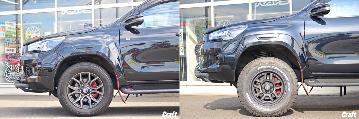 2.0インチアップで普通に見える。。。ちょいアゲ仕様でようやく大きく見える!! ハイラックスGRスポーツのカスタムはクラフト厚木店にお任せ下さいっ✨     いつもありがとうございます、クラフト厚木店・佐藤です!!   本日は 「 ハイラックスGRスポーツ 」 のカスタムをご紹介しますねっ✨   ハイラックスのカスタムを検討中の皆様、リフトアップ量はどの位を考えていますか?? 👀   上の画像を見ていただいても分かりますが、バランス良く仕上がっていますよね!?   当店で行うリフトアップは主に ドレスアップ を目的としたリフトアップが多いかも知れません。   っと言うのも、オーナー様にリフトアップの目的を伺うと、ほとんどのオーナー様が ” ドレスアップを目的としている ” とお答えいただくからです。     この様に、ゴツゴツとしたタイヤを装着し 「 いかにもオフロードを走りますっ 👍 」 って感じの見た目に仕上げる事が目的と言う訳ですよね!!   でも、カッコ良く仕上がった愛車に乗るのってとっても楽しいですし、テンションも⤴ ⤴ ますのでオフロードを走る事が目的でなくても良い訳です。笑   逆に、オフロードを走る事が目的であったり、本場アメリカで走ってそうなもの凄いリフトアップ量に仕上げるのもアリだと思います!!   ですが、ココは日本。   アメリカとは違い車検と言う物がありますので、やり過ぎるとその後の手続きが色々と面倒になる事も。。。   そんな意味では本日施工したハイラックスGRスポーツは良い手本になるのではないでしょうか!?     GUN125系のハイラックスは前期も後期も、そしてGRスポーツと、どのモデルも前下がりに見えてしまうおクルマですよね!?   そんな事からフロントの車高をアゲる事で見た目が大きく変わり、カッコ良いハイラックスに仕上がってくれるんですっ 👍   上の画像を見てもそのバランスの良さがうかがえますよね?? 👀   そんなリフトアップですが、実際にはどの位のリフトアップ量が望ましいのでしょうか。。。   1.5インチ?? 2.0インチ?? それともそれ以上??     ちなみに、本日ご紹介のハイラックスGRスポーツのリフトアップ量は 「 ちょいアゲ仕様 」 となります!!   1.5インチや2.0インチと言うのは理解出来ると思いますが、ちょいアゲ仕様って何でしょうかね!?   そう思った皆様、ちょいアゲ仕様とはワタクシ佐藤が命名したクラフト厚木店オリジナル仕様の事。笑   ちょいアゲと記載していますが、リフトアップ量は1.5インチや2.0インチを凌ぐ多めのリフトアップ量となります。   始めにも記載しましたが、ハイラックスは前下がりに見えるおクルマなので、2.0インチ程のリフトアップを行ってようやく 普通 に見えるんです。   そして2.0インチ程のリフトアップ量の場合、干渉を考えると装着出来るタイヤサイズは 「 265/70-17 」 辺りになるでしょう。     ですが、本日装着しているタイヤサイズは 「 275/70-17 」 となりま~す✨   タイヤとボディーが干渉しやすいハイラックスですが、リフトアップ量やホイールサイズを厳選する事で大きなタイヤサイズを装着する事が出来るんですよぉ~ 👍   この位のリフトアップ量に275と言う大きなタイヤを組合わせる事で、ハイラックスがけっこう大きくなったように見えてくれます。   これが カスタムの効果 なんすよねっ✨   ちなみに、本日のリフトアップ量(ちょいアゲ仕様)は リフトアップスペーサーやリフトアップスプリング では叶わないリフトアップ量となります。     本日ご紹介のハイラックスGRスポーツに装着しているリフトアップKITは オフロードメーカー 「JAOS 」 さんがリリースしているアイテムで「 BATTLEZ リフトアップセット VFCA Ver.A 」 となります!!   リフトアップスペーサーでもなく、リフトアップスプリングでもない 「 車高調整が可能なKIT 」 となっています 👍   その車高調整機能をうまく操る事でこのようにカッコ良いハイラックスに仕上げる事が出来る訳です。   それではノーマル車高とカスタム後のハイラックスを比べてみましょう!!     一目瞭然かも知れませんが、左が入庫時のハイラックスで右がカスタム後のハイラックスです。   前傾姿勢に見えるノーマルハイラックスが見事に変身していますよねっ✨   ちょいアゲ仕様と言う多めのリフトアップを行っていますが、やり過ぎ感はないですよね!?   このさりげなくデカく見えているところが皆様から多くのオーダーをいただいている理由ではないでしょうか。。。       それと、ハイラックスGRスポーツは ワイドフェンダー を装着しています!!   なので、通常のハイラックスに装着するホイールサイズと同じサイズを選ぶとホイールが引っ込んでしまうんですよね。。。   当然、本日装着しているホイールサイズはその辺も考慮したホイールサイズとなっていますよぉ~ 👍   ■ 装着ホイール:RAYS TEAM DAYTONA D108 8.0J-17インチ   いかがでしょう、右側のハイラックスはタイヤがボディー外側まで張り