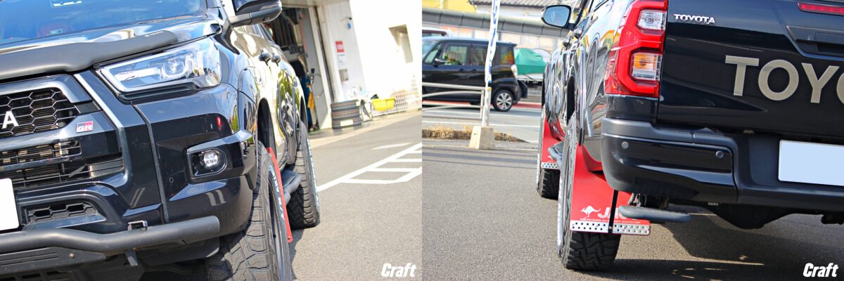 ハイラックスは 「 265/70R17 」 でも干渉するクルマ。。。 今回はJAOSマッドガードとの関係性も考慮しながら仕上げましたよぉ~✨     いつもありがとうございます、クラフト厚木店・佐藤です!!   本日のご紹介は、千葉県からお越しのT様・ハイラックスGRスポーツ。   ハイラックスと言えば、当店でもご相談が多く、今までにも多くの施工を行って参りました。   今回はその経験から得たノウハウで、オーナー様のご希望をしっかり叶える事が出来ましたよぉ~✨   それではコチラをどうぞ!!     T様からのご依頼は 「 タイヤ・ホイール交換 」 & 「 前下がりの補正(リフトアップ) 」 となります。   装着したリフトアップアイテムは 「 JAOS BATTLEZ リフトアップセット VFCA Ver.A 」 となり、車高の調整機能が備わっているモデルをチョイス。   今回オーナー様からいただいたご希望をクリアするには、この 車高調整式 と言う機能が必要だった訳です!!     上の画像はご入庫時のノーマル車高になります。   いたって普通のHILUX GR SPORTでしょうかね 👀👀   言ってしまえば、HILUX特有の前下がり感が見て取れます。。。   そして、ブレーキキャリパーとカラーを揃えたマットガードも装着しています。   今回はこの 「 マッドガードを装着している 」 と言う点に注意を払い、アイテム選びやセッティングを行いました🔧🔧     続いての画像は完成後のハイラックス。   見ての通り、車高が補正され、前下がり感もなくなっていますよねっ✨   前下がりの補正だけを考えた場合、同じくJAOSさんからリリースされているリフトアップコイルでもOK。   ですが、今回はタイヤサイズアップとそれに伴うマッドガードへの干渉も考え VFCA Ver.A を装着したんですよね。。。     まず、ハイラックスはタイヤサイズを大きくするとすぐに干渉問題が発生するおクルマ。   なので、どの位のリフトアップ量に仕上げるのかがとても重要!!   GRスポーツの場合、純正タイヤサイズが 265/60R18 となりますが、265/65R18 や 265/70R17 と言ったワンサイズアップ程度でも干渉問題がつきまとうんですよね。。。   しかも、ノーマル車高ではなく、リフトアップを行っていたとしてもです。汗     リフトアップを行っていないならともかく、リフトアップを行っているのに 「 ワンサイズアップ 」 も出来ないなんて、何だか残念ですよね。。。   ちなみに、干渉問題が発生するのは 「 フロント 」 のみとなり、更にはハンドルを切った時に限定されます。   そんなおクルマだからこそ、JAOSさんからインナーフェンダー加工KITが商品化されているんでしょうね 👀   それでは、HILUXはタイヤサイズを大きく出来ないのか??ってところですよね。   答えは 「 NO 」 です!!     当店でも 「 265/70R17 」 と言う定番サイズを筆頭に 「 275/70R17 」 や 「 285/70R17 」 などの2~3サイズアップまでのサイズはご要望も多く、多くの装着事例があります 👍   ですが、今回はJAOSマッドガードを装着しており、その部分の干渉を避けたいと言うご要望を加味しながらアイテムをチョイス!!   まずリフトアップアイテムに VFCA Ver.A をチョイスしたのは干渉を防ぐために 2.5インチ 程のリフトアップを行う必要があった為。   ちなみに、この仕様(リフトアップ量)の事を当店では 「 ちょいアゲ仕様 」 と呼んでいます。笑   ちょいアゲと言っても少し上がる訳ではなく、迫力の仕上がりとなりますよぉ~✨   そしてハンドルを切った際の干渉を抑える為に 「 265/70R17 」 と言うタイヤサイズをチョイス👍   この組み合わせにより、施工後もタイヤとマッドガードの干渉を抑える事も出来、オーナー様のご希望を叶える事に成功したと言う訳です。   そしてもう1つの拘りが出ヅラになります👀👀     上の画像のように、しっかりリフトアップを行った事で、タイヤサイズを大きくしながらもマッドガードへの干渉は回避。   そして最終ミッションはハイラックスGRスポーツのワイドフェンダーにマッチするホイールサイズの提案です!!   本日装着の RAYS DAYTONA D325 は見ての通り、オフ感漂うアイテム。   ですが、その良い雰囲気も出ヅラ次第では良さを引き出しきれないんですよね。。。   そんな訳でホイールサイズにも拘って仕上げた出ヅラがコチラ!!     前後ともに、キレイな出ヅラへと仕上がっていますよね!?   タイヤのサイドウォール部でギリギリの出ヅラ、これぞツライチと言った仕上がりっ 👍   特にHILUXは1ナンバー(普通貨物)の登録の為、プラドやランクル250などの普通乗用車とは基準が違います。   要は 「 タイヤ(ゴム部)の突出も許されない 」 クルマなんですよね。。。汗   そんな事から、今回のカスタムはリフトアップ量の計算や干渉を抑える為のタイヤサイズ、更には出ヅラと言った多くの計算が必要となるカスタム事案だった訳です。   そんなちょっと高度なミッションでしたが、当店で行ってきた多くの施工事例から得たノウハウで無事施工完了っ👍   これから愛