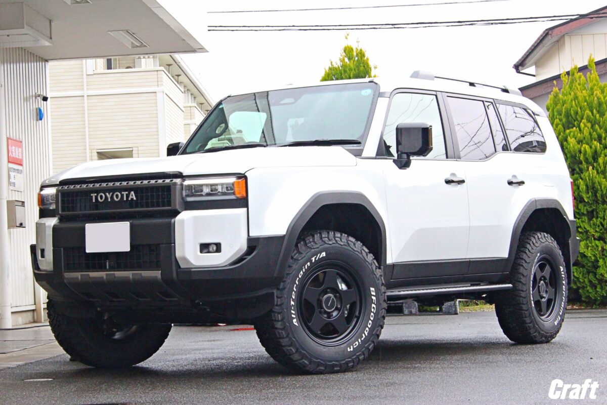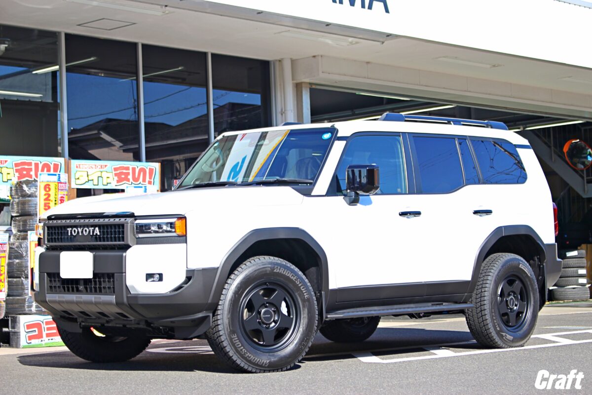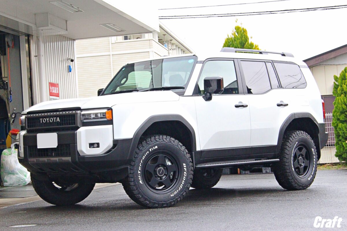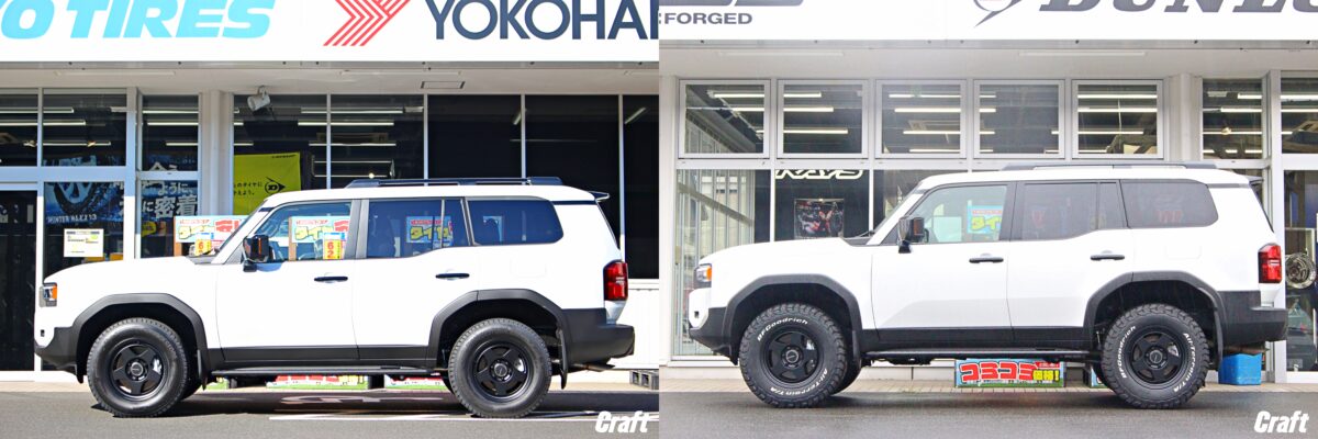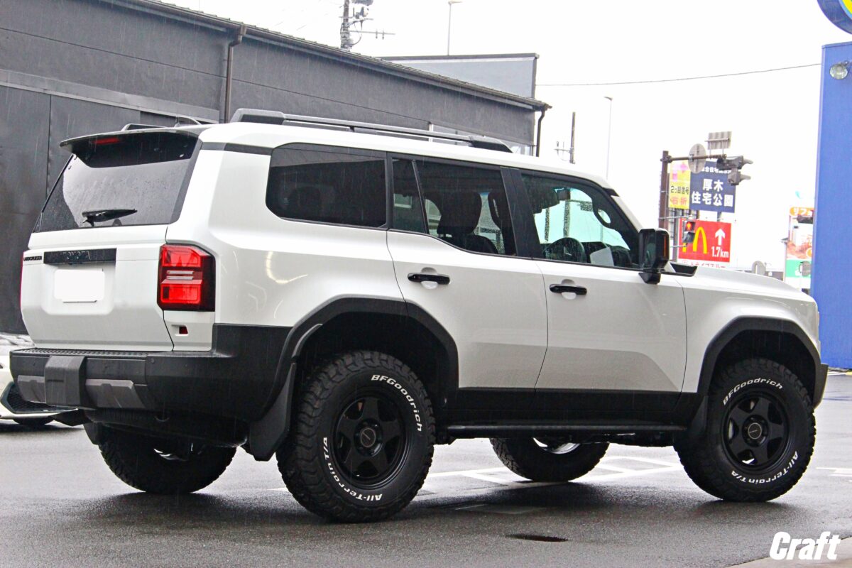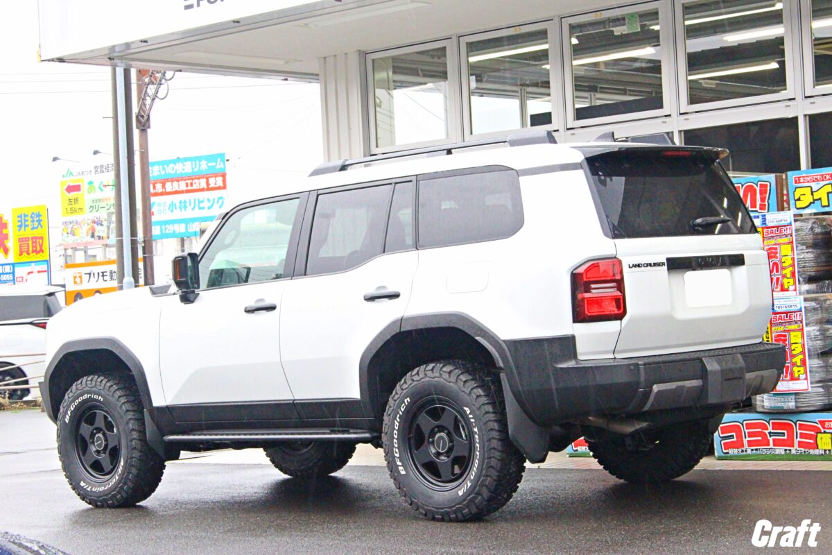 当店ではランクル250の施工事例も豊富にあり、車輛個体差のチェックからツライチセッティング、タイヤサイズアップまで幅広く対応中。