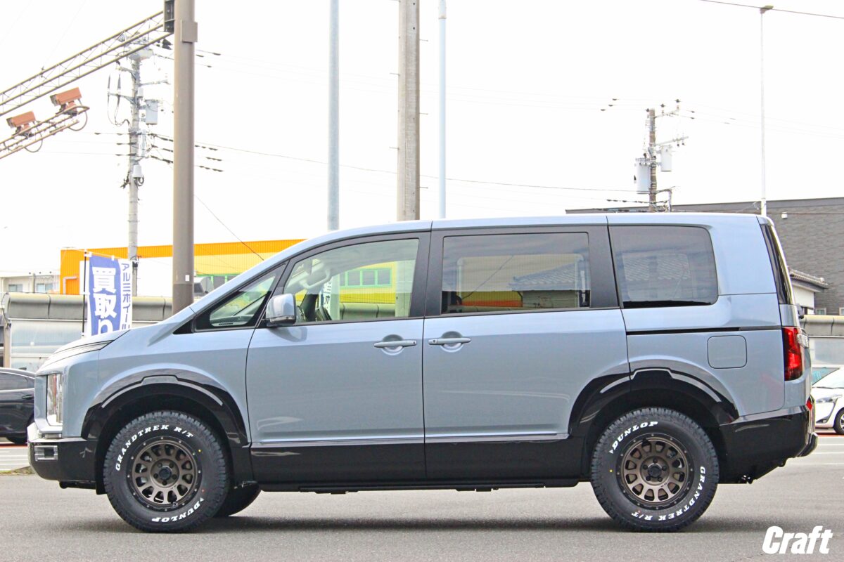ホイールサイズにお悩みのオーナー様必見!! ワイドフェンダー化された新型デリカD:5のホイールサイズを解説しますっ✨     いつもありがとうございます、クラフト厚木店・佐藤です!!   本日のご紹介はH様・新型デリカD:5。   2026年1月にMCを行った人気の4WDミニバン ” デリカD:5 ” が早くもブログに登場ですっ✨   納車後すぐに当店にお越しいただき、早速タイヤ・ホイール交換を行いましたよぉ~ 👍     ご購入いただいたホイールは 「 デルタフォースオーバル 」 となりま~す✨   今までにも多くの車輛に装着してきたデルタフォースオーバル。   ですが、新型デリカD:5はワイドフェンダー化された事で、ホイールサイズにお悩みのオーナー様も多いのではないかと思います。   現在納車待ちのオーナー様はこのブログをしっかりチェックし、カスタムのお役に立ててくださいね~✋     本日装着しているデルタフォースオーバルのカラーは マットスモークポリッシュ となります。   マットスモークポリッシュとは、ホイール全体をマットブラックに塗装したのちに ” ディスク面を切削➡スモーククリアで仕上げる ” と言った、少し手の込んだ工程で仕上げられています。   このスモーククリアで仕上げる事で1つのホイールカラーで2度楽しめるホイールに仕上がるんです。   違いが出るのは光が当たるタイミング!!   ホイールに差し込むその光がスモーククリアの下にあるアルミの素地に届き、ホイール全体が明るく輝きます。。。   これは装着していただいたオーナー様にしか分からない楽しみかも知れませんねっ♬♬     そして、オフ系カスタムの醍醐味でもあるホワイトレタータイヤとの相性もGood 👍   デリカD:5の16インチへのインチダウン時に装着するタイヤサイズと言えば 「 225/70R16 or 235/70R16 」 が主流かと思います。   そしてこのサイズは各タイヤメーカーさんから様々なアイテムがリリースされており、多くがホワイトレター仕様になっています。   こうして見ても、ホワイトレターの良さを引き立たせるとてもバランスの良いカラーリングですよねっ✨     もちろん、納車後1時間程でのホイール交換となりますので現在の車高はノーマル。   それでもMC後・新型デリカD:5の1番の注目ポイントでもある黒いワイドフェンダーが装着されている事で、リフトアップを行った車輛のようにフェンダークリアランスが広くなったように見えるんですよね。。。👀   そしてこのワイドフェンダーが装着された事で、ホイール交換時の悩みが1つ増えた訳です!!     ちなみに、このワイドフェンダーは片側10mm程の厚みと言われています。   そんな事から、ホイールサイズは今までのデリカD:5と同じサイズで良いのか??って話になっているんですよね。。。👀   ちなみに、デルタフォースオーバルも新型デリカD:5に向けた新たなサイズ設定を発売予定!!   そのホイールサイズは 「 7.0J インセット +26 」 となります。   ちなみに、従来のホイールサイズは 「 7.0J インセット +35 」 となっています。   J数は同じなので、新たに追加設定されるホイールはインセットの違いで9mm程外にオフセットされると言う訳。   ですが、ワタクシ佐藤が車輛をチェックしたところ、そう簡単な話ではなさそうなんです。。。     その理由はフロントのインナーカバーの仕様変更にあります!!   ワイドフェンダー化された事で、従来のインナーカバーとは形の違う物を用意しなくてはいけなくなったのでしょう。   ですが、このインナーカバーの仕様変更により、今までのデリカD:5よりクリアランスが狭くなってしまったんです。。。     上の画像は右フロントタイヤ。   ハンドルを右に切り込んだ状態でクリアランスのチェックを行いましたが、見ての通りなかなか狭いクリアランスとなっていました。。。   要はワイドフェンダー化されたからと言って単純にホイールを外にオフセットすれば良いと言う話でもなさそうなんです。汗   ホイールのインセットが変われば、このタイヤが動く位置関係も変わり、インナーカバーへの干渉が発生するかも知れないと言う事!!   そんな事から新型デリカD:5はホイールサイズとタイヤサイズの両方を考慮しながら選ぶ必要がありそうですよね。   ちなみに本日は従来のデリカD:5用サイズを装着しています。   そこで気になるのが出ヅラについてですよね!?   それでは次の画像をチェックしてみましょう!!     あれ!?   思った程引っ込んだ出ヅラにはんっていませんよね!?   むしろ、これ位の出ヅラでも全然アリだと思ってしまうちょうど良い出ヅラにも思えます。   ちなみに装着後に実車計測を行ってみましたが、1番ゆとりの少ないところでは5~10mm程しかクリアランスがなかったんですよね。。。   そうなると、インセット+20台を装着するとインナー干渉の可能性にプラスしてタイヤの突出も気にしなければいけなくなってきますかね。   まだまだ入庫数も少なくデータが足りませんが