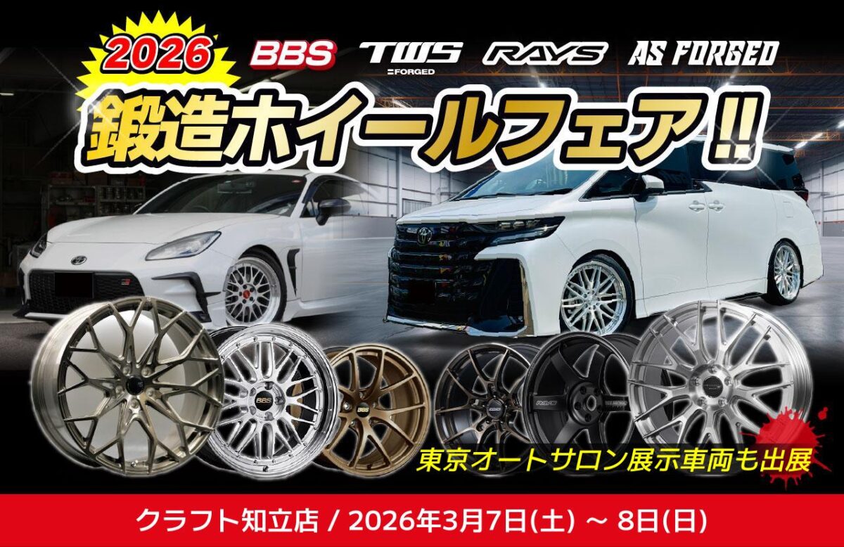 2026年3月7日(土)~3月8日(日)の2日間限定で 鍛造ホイールフェアをクラフト知立店にて開催致します!! 出展メーカーは BBS / TWS / Rays / AS Forged (順不同) 国産鍛造ホイールで人気のBBS、TWS、Rays 海外フルオーダー鍛造ホイールでお問い合わせの増えているAS Forged ※以前のイベント風景です 駐車場にこれでもか!!という程 鍛造ホイールばかりを展示させて頂きます♪ 当店で数多くお取付けさせて頂いておりますTE37シリーズは 通常オプションカラーはベースカラーからプラス料金が発生するのですが、 2026年12月末までオプションカラーがなんと無料になるキャンペーンも!! 詳しくはメーカーホームページをご覧下さい。   →レイズホームページへはコチラをクリック ※以前のイベント風景です 海外フルオーダー鍛造ホイールではAS Forgedに加え 東京オートサロン2026にて阿部商会様ブースにて車両出展した 当店スタッフのフェアレディZ(Z32)も展示!! 当日は当時物のモデナを履いて展示を行う予定です♪ 各メーカーの営業マンもイベント当日は常駐しております。 そのアイテムに一番詳しいメーカースタッフが オーナー様とお話する事も出来ますので 是非この機会をご活用頂けたらと思います♪   展示アイテム達が入荷しましたら、またご報告させて頂きます!! 皆さまのご来店、ご相談、スタッフ一同お待ちしております!!
