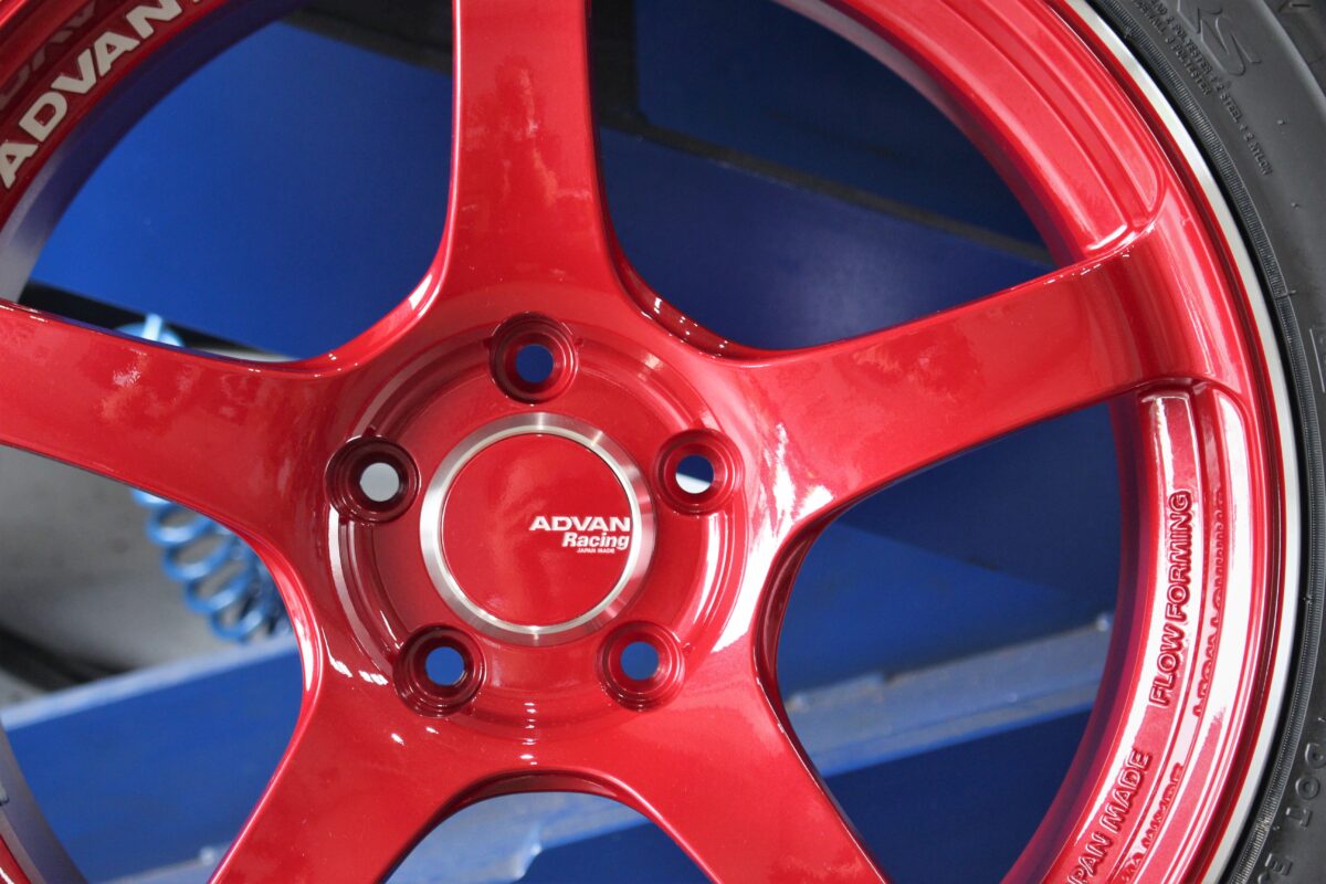 フローフォーミング工法で製造されるアドバンレーシングの鋳造ホイールは軽量・高剛性スポーツ走行にはピッタリです(*^^*)赤いホイールであることがお客様の拘りポイントでした!
