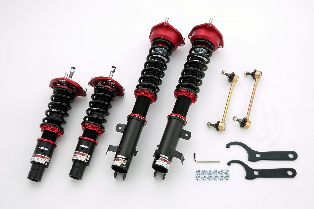 赤と黒を組み合わせ、スポーティーな見た目で人気のBLITZ車高調ZZ-Rでローダウンを行います。