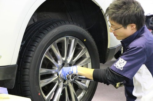 タイヤ交換後は、トルクレンチを使い規定トルクにて締め付け確認を行い