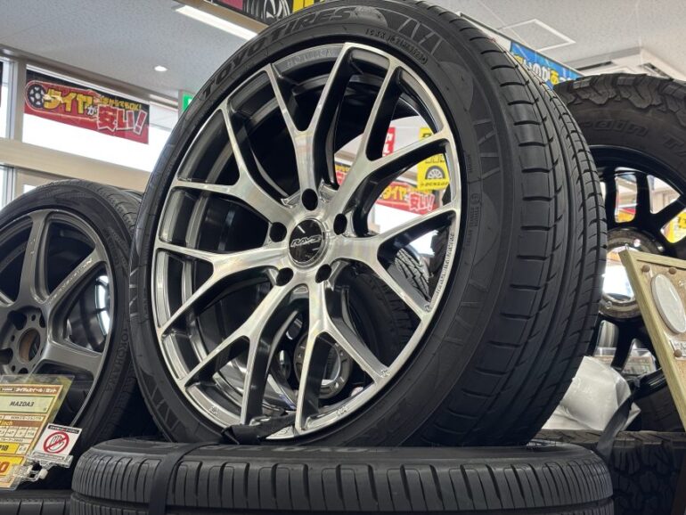 いつもブログをご覧いただきましてありがとうございます! 埼玉の大宮バイパス店の霜田です('ω')ノ 40系アルファード&ヴェルファイアオーナー様、20インチへのインチアップはいかがでしょうか? RAYS HOMURA 2x7FTセットが大宮バイパス店に入荷いたしました~! 【ホイール】 RAYS HOMURA 2x7FT (F/R) 8.5J 20inch INSET+45 5H PCD120 QAJカラー 【タイヤ】 TOYO プロクセス FD1 (F/R) 245/45R20 カッコ良くてコストパフォーマンスも高いRAYS HOMURAシリーズ、2x7FTは「より大きく、より長く」をテーマにアップデートされたモデル。 デザイン面の天面はフラットテーパー形状が採用され、よりシャープにエッジの際立ったスタイリッシュな印象です。 ワンペイントにも見えますが、スポークサイドはグレイスシルバーというハイパー系のペイントで天面はダイヤモンドカットという 二面性を持ち合わせたQAJカラーとなります。 光が当たるごとに天面のダイヤモンドカットがキラッと輝き、停まっていても走っていても様になるいわゆるカッコいいやつ。 ホイールの表面、裏面、ハブ裏部分、全てにおいて申し分ないグッドコンディション。 USEDアイテムとしては非常に綺麗な1セットと泣ております。 タイヤはTOYO プロクセス FD1がセットされており、2023年製と年式もまだまだ新しめです。 残り溝も多く、サイズは245/45R20 103ですので40系アルファード&ヴェルファイアへも耐荷重の心配なく装着可能です。 在庫は店頭に1セット!この記事が上がる前に完売してしまったらごめんなさい! こちらの商品は店頭にて展示販売&ヤフーオークションで出品中となります。 完売の際はご了承ください。 【2026年4月2日(木)~4月30日(木)グランドオープンイベント開催】 Webで購入!! ヤフオクストア