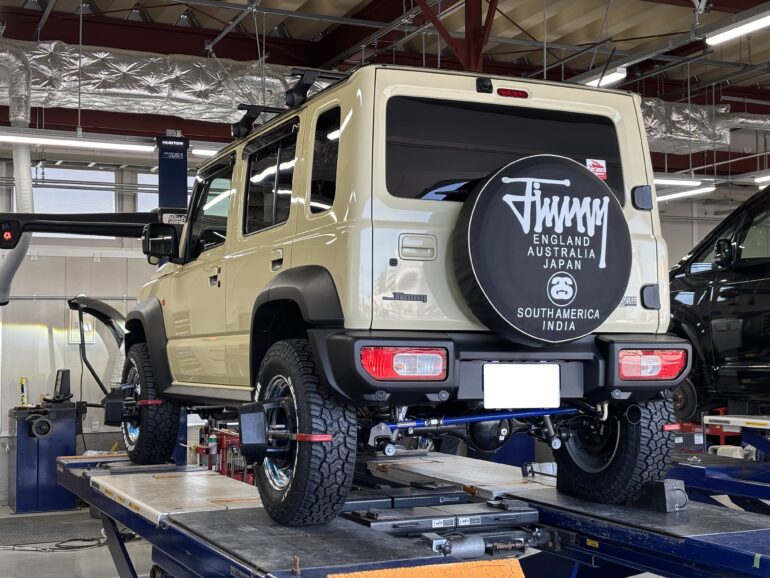 純正ホイール+スタッドレスタイヤでの走行中、特に不具合といったものはございませんでしたが、リフトアップされてNEWタイヤホイール、現状の状態を知るという意味でも3Dアライメントを施工です。