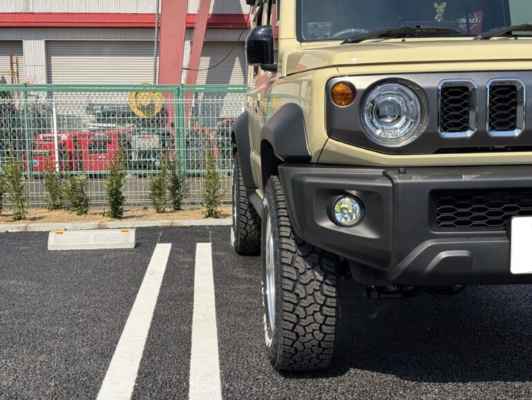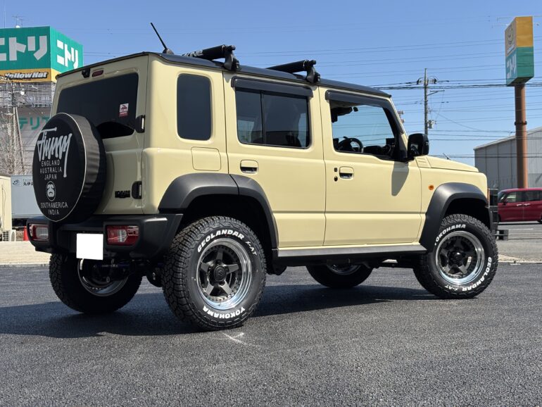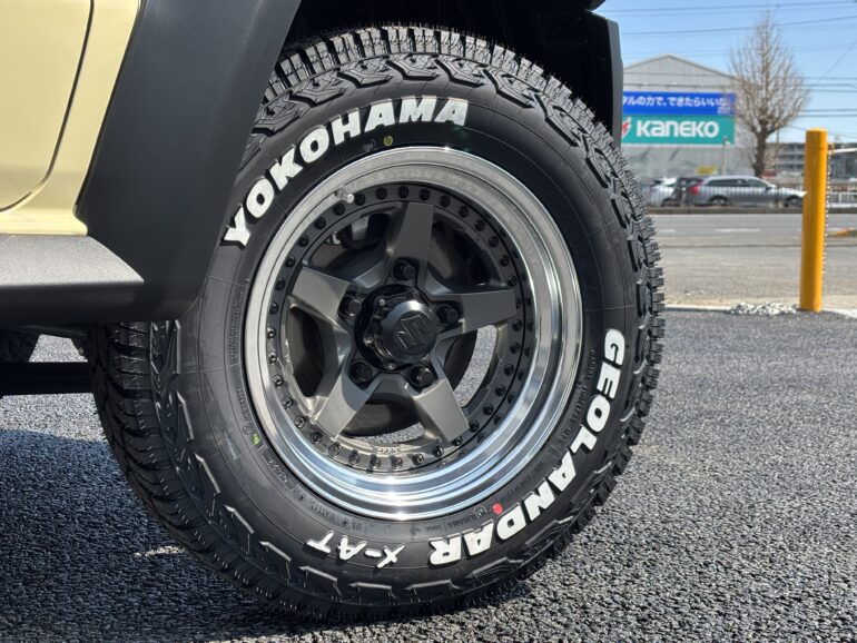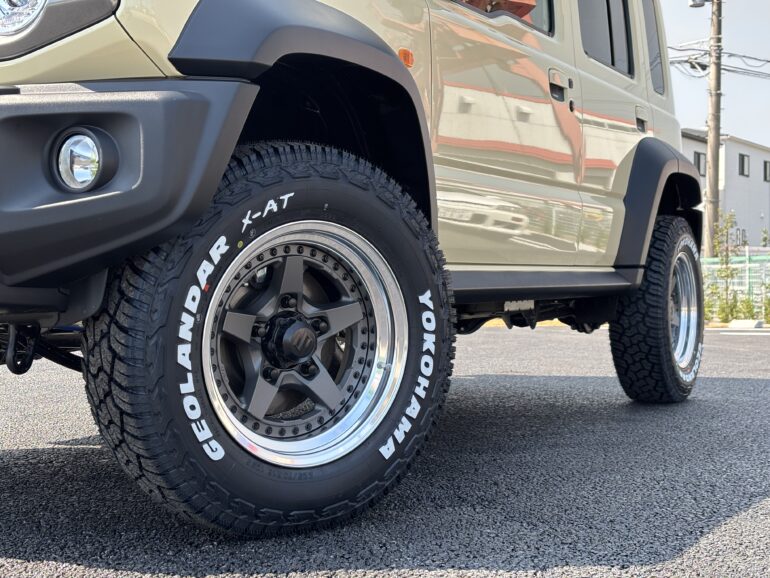 オフロード系カスタム=マットブラック1ピースホイールという王道からあえてハズしたリム有り3ピースホイールという選択。