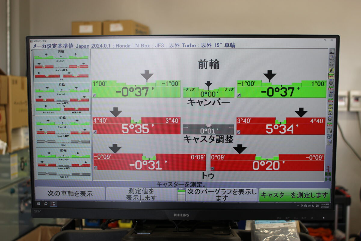 まっすぐ走らず左に流れるとの事で、まずは測定を行い現状の確認。
