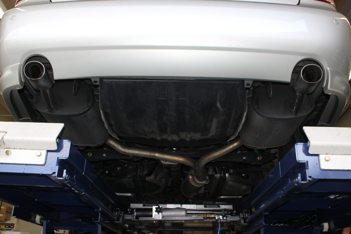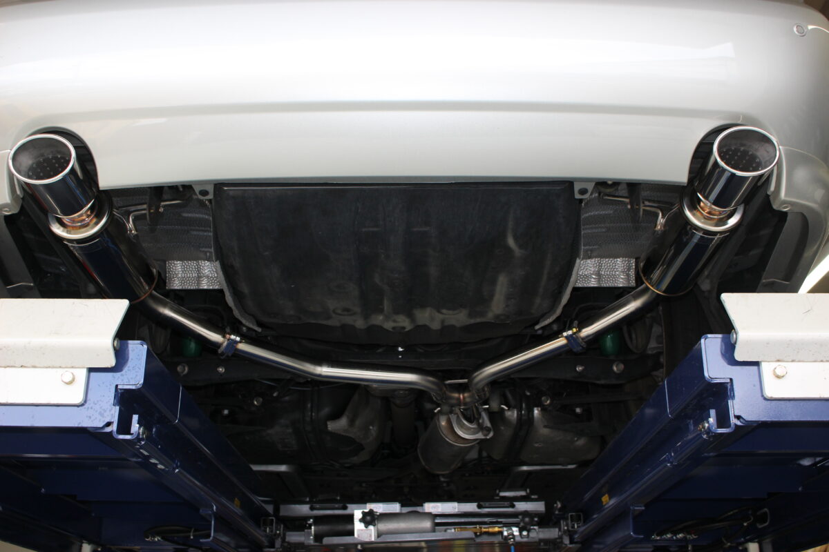 中間から二つに伸びるツインマフラーは純正だとタイ鼓部分が大きく、見た目通り高重量になっています。
