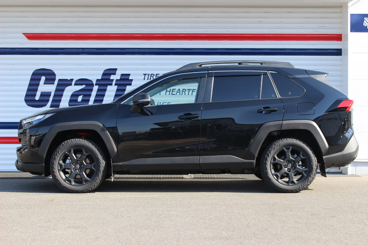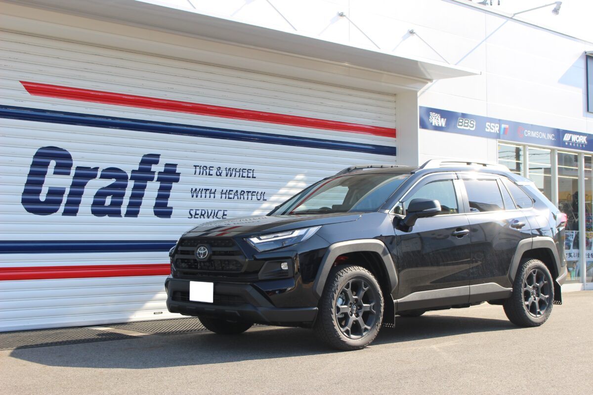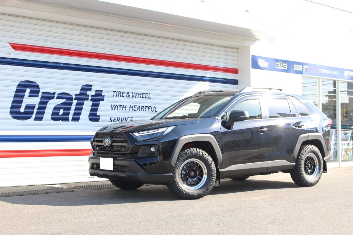 こんにちは中島です! 本日ご紹介させて頂くのはトヨタ RAV4アドベンチャー。 今回は当店初装着のクラフト限定ホイールを選んで頂きました(*^^)   モデルはRAYS デイトナM9。 スポーツモデルが多いRAYSホイールの中でもSUV向けブランドのデイトナシリーズ。 シリーズの中でもこのM9は、RAV4やデリカオーナー様に人気のモデルとなります(^^) 粗めのメッシュデザイン+ビードロック風なリムフランジ構造で かなりオフ感強めなデザインとなっておりますよ~   カラー設定の多いM9ですが、今回はクラフト50周年コラボカラーの 「ブラック/ディスククリアスモーク+マットクリア」を選んで頂きました♪ 名前の通り、通常カラーのブラック/ディスククリアスモークをマット仕上げにしたカラー。 ディスク部分のマット仕上げは非常に独特な色味となっております( ̄ー ̄)   クラフト50thモデルは17インチのみの設定。 RAV4には一番人気のインチ設定となっています(^^) タイヤの肉厚感を強調しつつも、ホイールの大きさもしっかり際立つサイズ。 ホイールの出幅等もRAV4にはジャストサイズです♪   タイヤは最近流行のBFグッドリッチ トレイルテレーン! オールテレーンに比べマイルドなトレッドパターンで、ゴツゴツし過ぎないデザイン。 ホワイトレターもアウトラインタイプとなりお洒落な雰囲気となりますね(*^^)   タイヤ幅は純正よりも少し太い245サイズをチョイス。 7.0Jのホイールへの組合せでムチムチなスタイルとなります( ̄ー ̄) 通常グレードに比べフェンダーの少し広いアドベンチャーグレードですと ノーマル車高でそのまま装着OKです!   純正19インチから2インチダウンで、よりオフ感が強まってくれましたね♪ RAV4はグレードによりカスタムの方向性が大きく変わるお車。 リフトアップにインチダウン、ローダウンにインチアップと どの方向性のカスタムもお任せ下さい(^^)   今回のカスタムスペック ホイール:RAYS デイトナM9 クラフト50th (F/R)7.0J-17インチ カラー:CFP タイヤ:BFグッドリッチ トレイルテレーン (F/R)245/65R17   迫力の仕上がりにオーナー様にも大満足して頂きました♪ 今回は当店をご利用頂きありがとうございます(*^^)