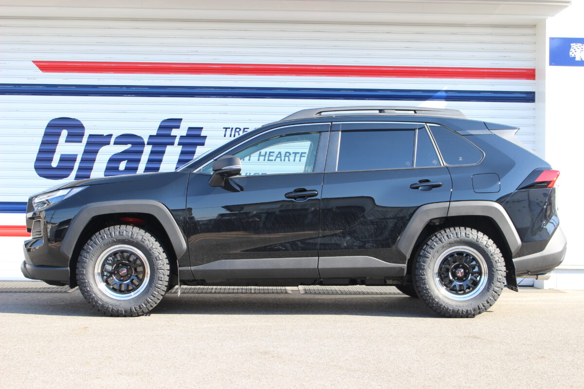 RAV4に太履き265/65-17を装着!! 出ヅラはどんな感じに仕上がる???   いつもありがとうございます!!クラフト厚木店・のりかずです。   本日のご紹介はI様・RAV4。   タイヤ・ホイール交換に加えリフトアップも一緒に施工していきます!     まずはこちら、入庫前のRAV4です。   今回のRAV4は「アドベンチャーオフロードパッケージ」というグレード。   RAV4に乗っている方なら知っているかもしれませんが、ほかグレードよりも10mm程車高が高いグレードになりますね。   そして今回取り付けたリフトアップアイテムは「ACC イージアップ1.5インチキット」、約38mm車高が上がるアイテムとなります。   38mm+10mmで48mmってことは約2インチ近く上がることになりますね♪     そして今回取り付けていくタイヤホイールがこちら   ホイール:RAYS デイトナM9+ 7.0J-17インチ   タイヤ:ヨコハマ ジオランダーAT4 G018 265/65-17   RAV4では245/65-17をよくご注文いただきますが、今回はもうワンサイズアップの265/65-17をチョイス。   外径が更に大きくなるのでリフトアップを行っている車軸なら、バランスはいい感じです✨✨     265/65-17となるとタイヤの存在感がすごいですよね👍   ちなみに外径の差となると直径で約49mm、半径で約24mmとなっています。   今回のリフトアップと合わせると約72mm(3インチ)になりますよ(笑)       見比べてみるとだいぶ変わっていますよね👍   ちなみに「265/65-17を装着したい!けど干渉問題はどうなの?」とよくご相談を頂くことが多いです。   しかし、ホイールサイズによってかなり変わるのでその都度ご相談くださいね♪     そして最後に出ヅラです!   いい感じの出ヅラに仕上がってくれていますよ!   RAV4でもツライチにしたいって方は265/65-17を検討してみてはいかがでしょうか!   注意事項等もありますので、店頭で聞いてみてくださいね♪   それではご相談お待ちしております!!     I様この度はクラフトをご利用いただきありがとうございました!!   ホイールの入荷にかなりお時間をいただいてしまい申し訳ございませんでした。。。。💦   265/65-17の迫力すごかったですよね!   そして何より72mmの車高の変化は驚きではないでしょうか!   また、ぜひクラフトをご利用ください!!   管理番号:0412510051001