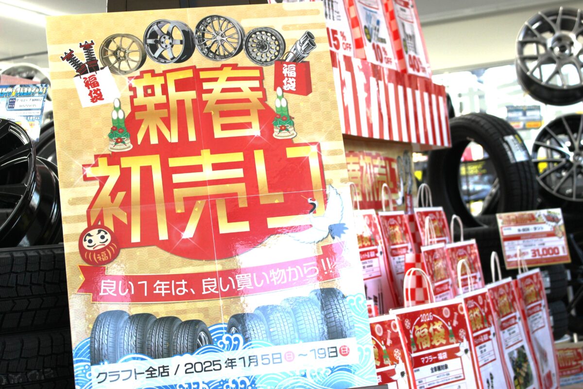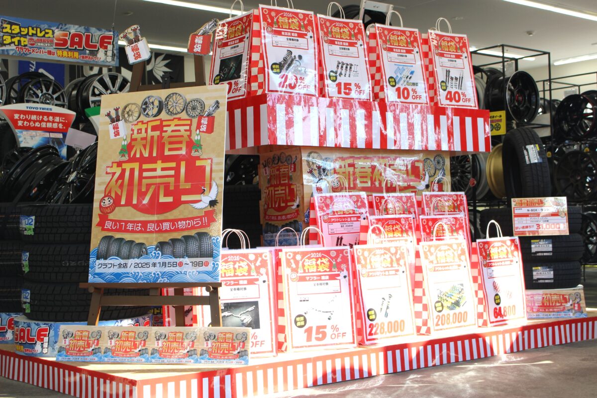 ■クラフト全店にて12月30日~1月4日までお休みを頂きます。   2026年1月5日から開催します!!新春初売りセール!!!   対象アイテムはタイヤや車高調・マフラーとカスタムパーツが対象となっていますよ~♪   良い1年はいい買い物から!!ってことでお買い得な商品もご準備しておりますので沢山のご来店お待ちしております♪   ■新春企画【1】 タイヤがコミコミ価格で安い!!   ■新春企画【2】車高調をスペシャル価格で販売!!   人気メーカーの車高調を通常割引よりも更に割引率を上げて販売します!!   新年早々ローダウンやリフトアップを検討中のお客様はチャンスです!!   対象の車高調は以下の通り🔥 ・BLITZ ダンパーZZR ・HKS ハイパーマックスS ・TEIN RX1 ・TANABE GT FUNTORIDE Dumper  ・4x4エンジニアリングサービス カンサスキット   ※クラフトで施工ができない車種がございます。 ※取付なしのお持ち帰りは行っておりません。 ※工賃・アライメント料は別途必要です。   ■新春企画【3】早い者勝ち!在庫アウトレットサスペンション大放出!!   展示商品や在庫商品を初売り特価で販売いたします!!   愛車に適合した在庫商品があれば超超お買い得となるセール!!   ちなみにクラフト全店で開催しているので、売り切れの場合はご了承くださいね!!   ■新春企画【4】新春セール限定!マフラーをスペシャル価格で大売出し!   人気メーカーのマフラーが通常よりも割引率アップとお得になります!!   対象メーカーは以下の通り🔥 ・HKSマフラー全品 (VIITSマフラー・フロントパイプ単品・センターパイプ単品を除く) ・BLITZマフラー NURシリーズ全品(NUR-SPEC VSR / NUR-SPEC VS 国産車用のみが対象) ・柿本改マフラー(競技用・NSX用を除く) ・FUJITSUBOマフラー(スーパーチタン・チタンを除く) ・JAOSマフラー   ※クラフトで施工できない車種がございます。 ※取付なしのお持ち帰りは行っておりません。 ※工賃が別途必要です。   ■新春企画【5】売り切れ御免!在庫アウトレットタイヤ大放出!   展示などで使っていたスポーツタイヤやオフロードタイヤ、そしてスタッドレスタイヤをアウトレット価格で販売します!!   気になっていたあのタイヤが安く手に入るチャンスかも!??     それでは新年1月5日から沢山のご来店お待ちしております!!