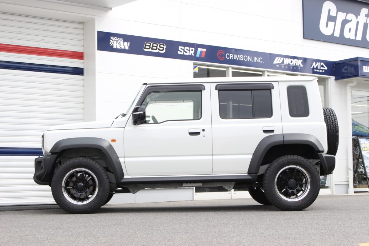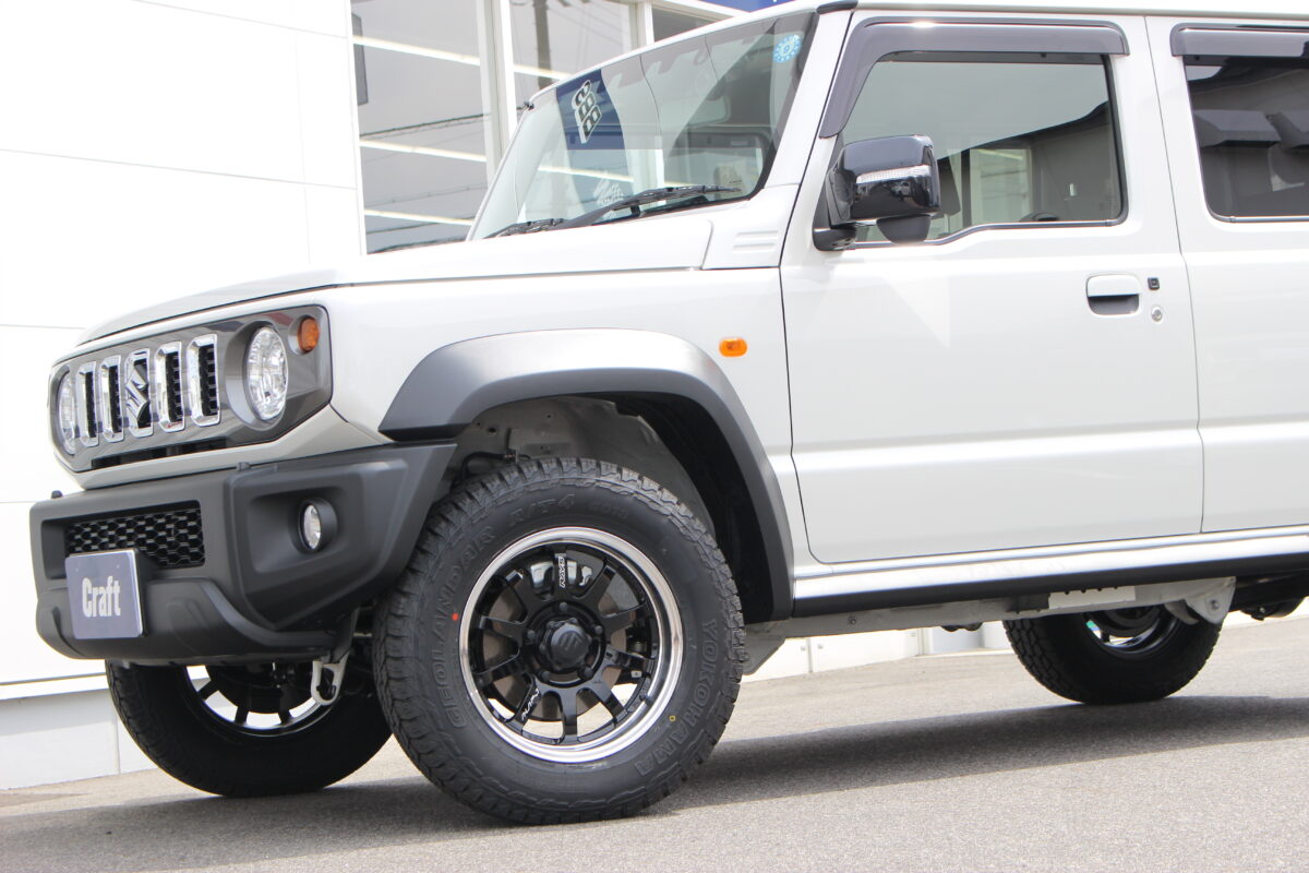 【JB64ジムニー】限界タイヤサイズに挑戦!マッドクロス レンジャー×オプカンRT(225/70R16)装着。あえてのブラックレターで渋くキメる!   ジムニーのご来店が多いクラフト一宮店です。 本日は、カスタムのご相談が連日鳴り止まない 大人気本格四駆、JB64ジムニーのご紹介です。   ジムニーのカスタムといえば、 「とにかくタイヤを大きくして、ゴツく見せたい!」 という熱いご要望が一番多いですよね。 純正の175/80R16から、185や215などへのサイズアップが定番ですが…… 今回はさらにその先を行く、超・ド迫力なセッティングを施工させていただきました。 「えっ、そのサイズ入るの!?」と驚くこと間違いなしの、極太スタイルをご覧ください。     まずは装着するホイールから。 オフロード感満載のタフなデザインが魅力の 「マッドクロス レンジャー」をセレクトしました。 シンプルで無骨なデザインが、 ジムニーのレトロでカクカクしたボディにこれ以上ないほどマッチします。 カラーは王道の「マットブラック」をチョイス。 足元を真っ黒に引き締めることで、 より一層の無骨さと重厚感を演出してくれます。     そしてタイヤです。 JB64ジムニーにおける限界タイヤサイズとも言える 「225/70R16」をお選びいただきました。 純正から比べると二回り以上も大きく、幅も太いこのサイズ。 フェンダーの隙間をパツパツに埋め尽くす圧倒的なボリューム感は、 他のサイズでは絶対に味わえません。 (※お車の仕様によって干渉のリスクがあるため、プロのノウハウが必須なサイズとなります。)     そして注目すべきは、このサイズで未設定のブラックレターです。 昨今はホワイトレターが大ブームですが、 今回はあえてロゴを白く塗らない黒文字仕様。 無骨さを最大に味わえるようにタイヤを裏組しています。   マットブラックのホイールと合わさることで、 一切の装飾を削ぎ落とした 「ガチの戦闘車両」のようなストイックなカッコよさが生まれるんです。 このセンス、本当にシビれます。     いかがでしょうか、この凄まじい迫力。 JB64ジムニーのコンパクトなボディに、 限界タイヤサイズである225/70R16のオプカンRTが、 もう笑ってしまうくらいパツパツに収まっています。     マッドクロス レンジャーの重厚なデザインと、 極太タイヤの組み合わせが生み出すこの「塊感」。 ブラックレターで統一された足元が、 車全体をめちゃくちゃスパルタンな雰囲気に仕立て上げています。 街中はもちろん、 泥だらけのオフロードコースが これほど似合うジムニーもなかなかありません。     この度はご用命いただき、誠にありがとうございました。 JB64ジムニーのポテンシャルを極限まで引き出す、 漢気あふれる素晴らしいカスタムになりました。     当店では、ジムニーのタイヤサイズアップのご相談を大得意としております。 「自分の車に限界タイヤサイズが入るのか知りたい!」 「ホワイトレターも良いけど、渋いブラックレターで揃えたい!」 そんな熱い想いをお持ちのオーナー様、ぜひ一度ご相談ください! 皆様のご来店、スタッフ一同心よりお待ちしております。     それではまた次回のブログもお楽しみに。 クラフト一宮店でした。   管理番号:0042604021012