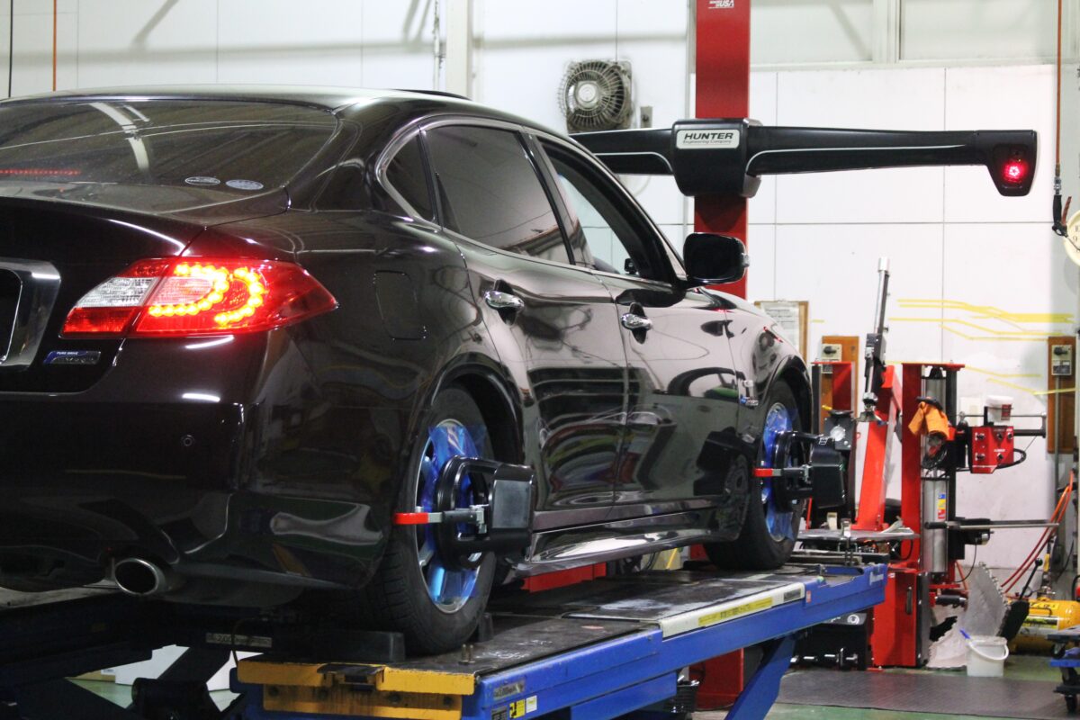 直進安定性の向上はもちろん、高級車にとって重要な「タイヤの偏摩耗防止」にも直結する、非常に重要な工程です。