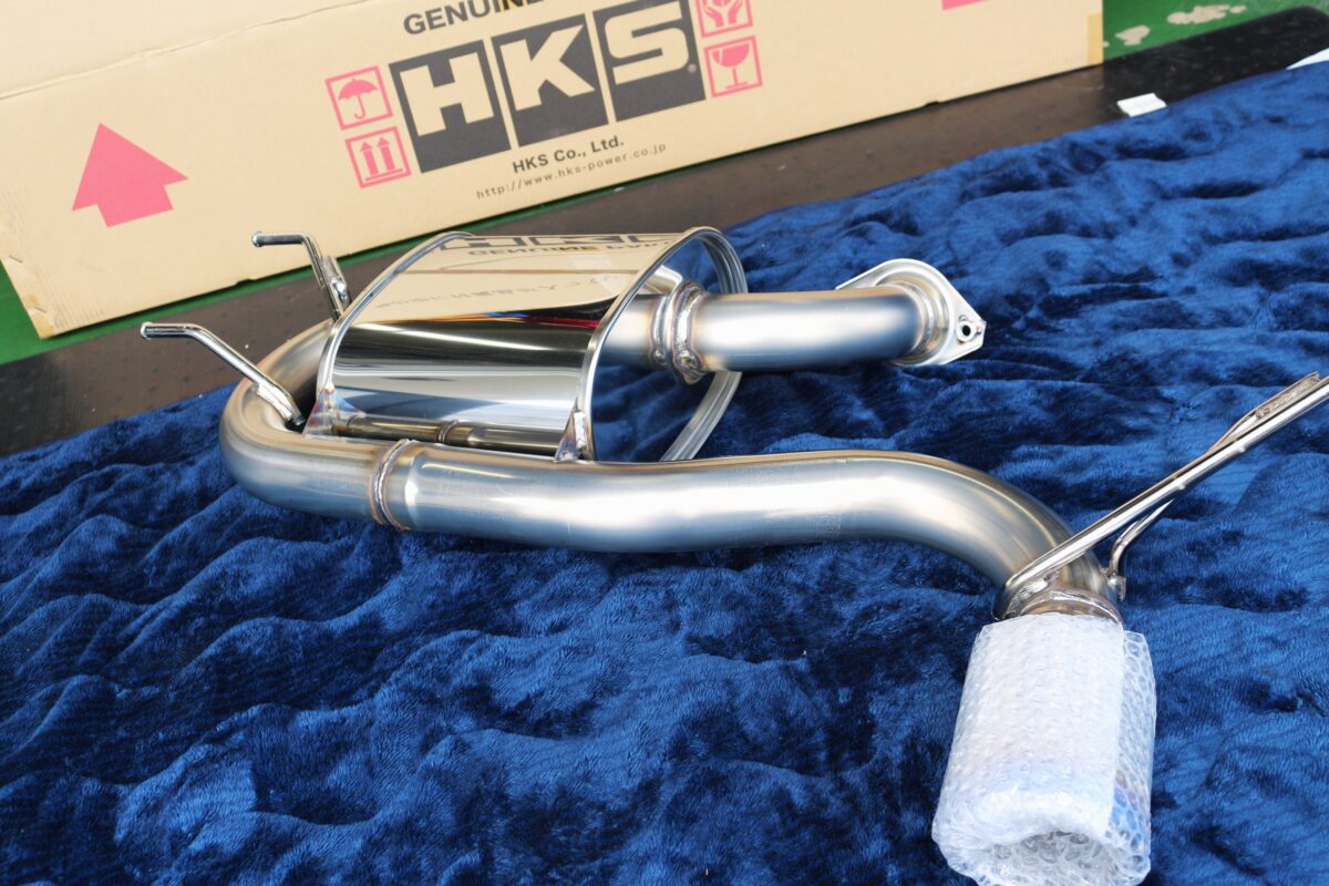 HKSさんのラインナップ!シングル出しチタンブルーのスポーツマフラーです👀スーパーチャージャーやターボの後付までカバーできるよう低排圧にこだわり、非常に抜けの良いマフラー。