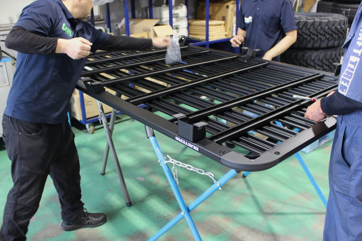 ラック前方に配置された「BUSTERS」のロゴや、パウダーコート塗装の質感。これだけでリアビュー、サイドビューの迫力が一変します。アウトドア派なら誰もが二度見する、圧倒的なオーラを放ちます!