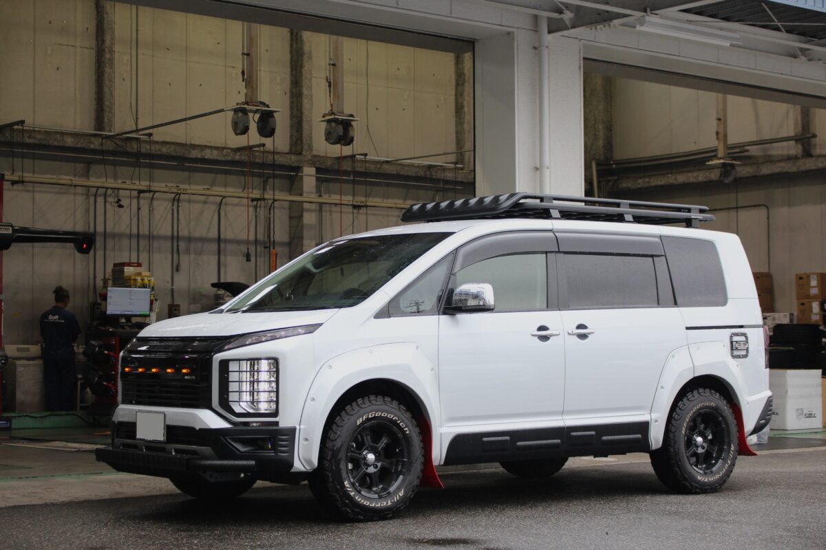 ピットでの作業完了後、その姿を見てスタッフ一同「カッコいい…」と声が漏れてしまいました。 ノーマル状態でも力強いデリカD5ですが、オートフラッグス バスターズ2080HD改を纏うことで、より「冒険へ連れ出してくれるギア感」が強調されました。