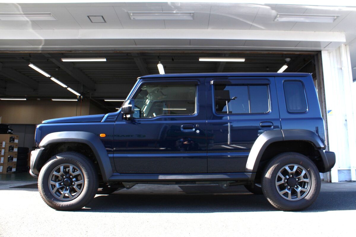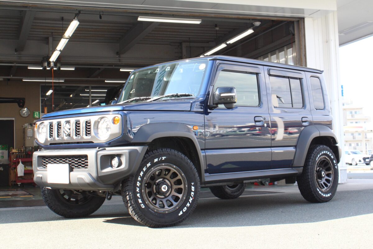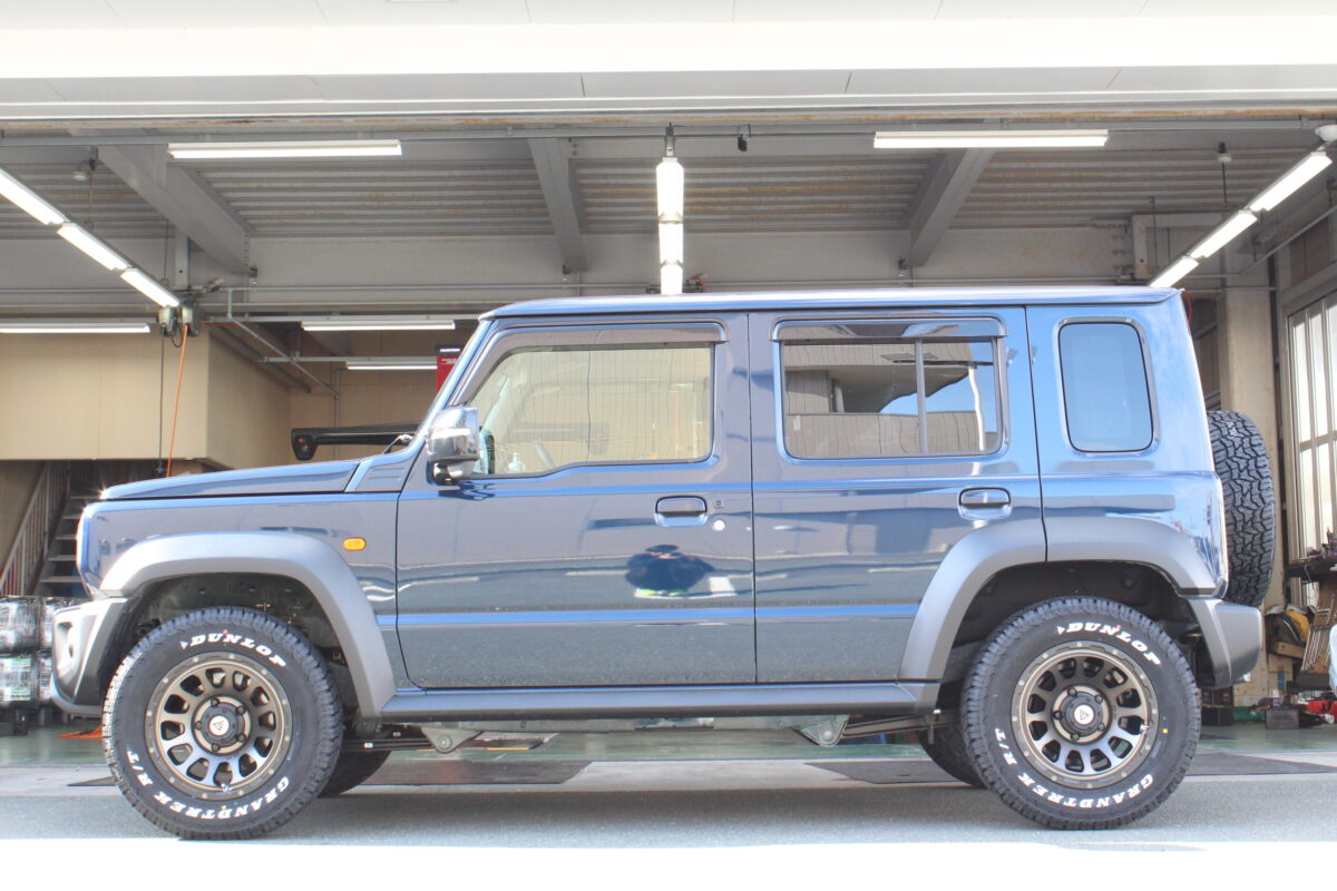 【JB64ジムニー】限界タイヤサイズに挑戦!マッドクロス レンジャー×オプカンRT(225/70R16)装着。あえてのブラックレターで渋くキメる!   ジムニーのご来店が多いクラフト一宮店です。 本日は、カスタムのご相談が連日鳴り止まない 大人気本格四駆、JB64ジムニーのご紹介です。   ジムニーのカスタムといえば、 「とにかくタイヤを大きくして、ゴツく見せたい!」 という熱いご要望が一番多いですよね。 純正の175/80R16から、185や215などへのサイズアップが定番ですが…… 今回はさらにその先を行く、超・ド迫力なセッティングを施工させていただきました。 「えっ、そのサイズ入るの!?」と驚くこと間違いなしの、極太スタイルをご覧ください。     まずは装着するホイールから。 オフロード感満載のタフなデザインが魅力の 「マッドクロス レンジャー」をセレクトしました。 シンプルで無骨なデザインが、 ジムニーのレトロでカクカクしたボディにこれ以上ないほどマッチします。 カラーは王道の「マットブラック」をチョイス。 足元を真っ黒に引き締めることで、 より一層の無骨さと重厚感を演出してくれます。     そしてタイヤです。 JB64ジムニーにおける限界タイヤサイズとも言える 「225/70R16」をお選びいただきました。 純正から比べると二回り以上も大きく、幅も太いこのサイズ。 フェンダーの隙間をパツパツに埋め尽くす圧倒的なボリューム感は、 他のサイズでは絶対に味わえません。 (※お車の仕様によって干渉のリスクがあるため、プロのノウハウが必須なサイズとなります。)     そして注目すべきは、このサイズで未設定のブラックレターです。 昨今はホワイトレターが大ブームですが、 今回はあえてロゴを白く塗らない黒文字仕様。 無骨さを最大に味わえるようにタイヤを裏組しています。   マットブラックのホイールと合わさることで、 一切の装飾を削ぎ落とした 「ガチの戦闘車両」のようなストイックなカッコよさが生まれるんです。 このセンス、本当にシビれます。     いかがでしょうか、この凄まじい迫力。 JB64ジムニーのコンパクトなボディに、 限界タイヤサイズである225/70R16のオプカンRTが、 もう笑ってしまうくらいパツパツに収まっています。     マッドクロス レンジャーの重厚なデザインと、 極太タイヤの組み合わせが生み出すこの「塊感」。 ブラックレターで統一された足元が、 車全体をめちゃくちゃスパルタンな雰囲気に仕立て上げています。 街中はもちろん、 泥だらけのオフロードコースが これほど似合うジムニーもなかなかありません。     この度はご用命いただき、誠にありがとうございました。 JB64ジムニーのポテンシャルを極限まで引き出す、 漢気あふれる素晴らしいカスタムになりました。     当店では、ジムニーのタイヤサイズアップのご相談を大得意としております。 「自分の車に限界タイヤサイズが入るのか知りたい!」 「ホワイトレターも良いけど、渋いブラックレターで揃えたい!」 そんな熱い想いをお持ちのオーナー様、ぜひ一度ご相談ください! 皆様のご来店、スタッフ一同心よりお待ちしております。     それではまた次回のブログもお楽しみに。 クラフト一宮店でした。   管理番号:0042604021012
