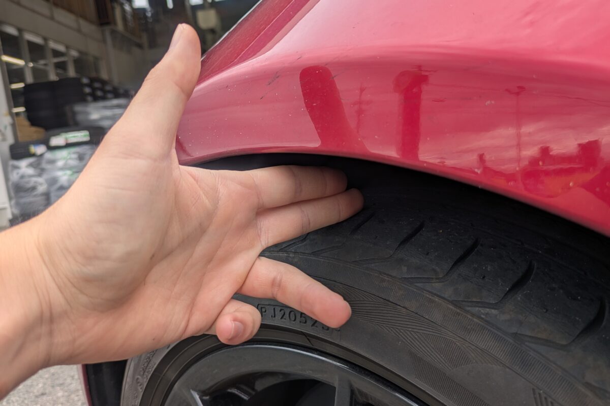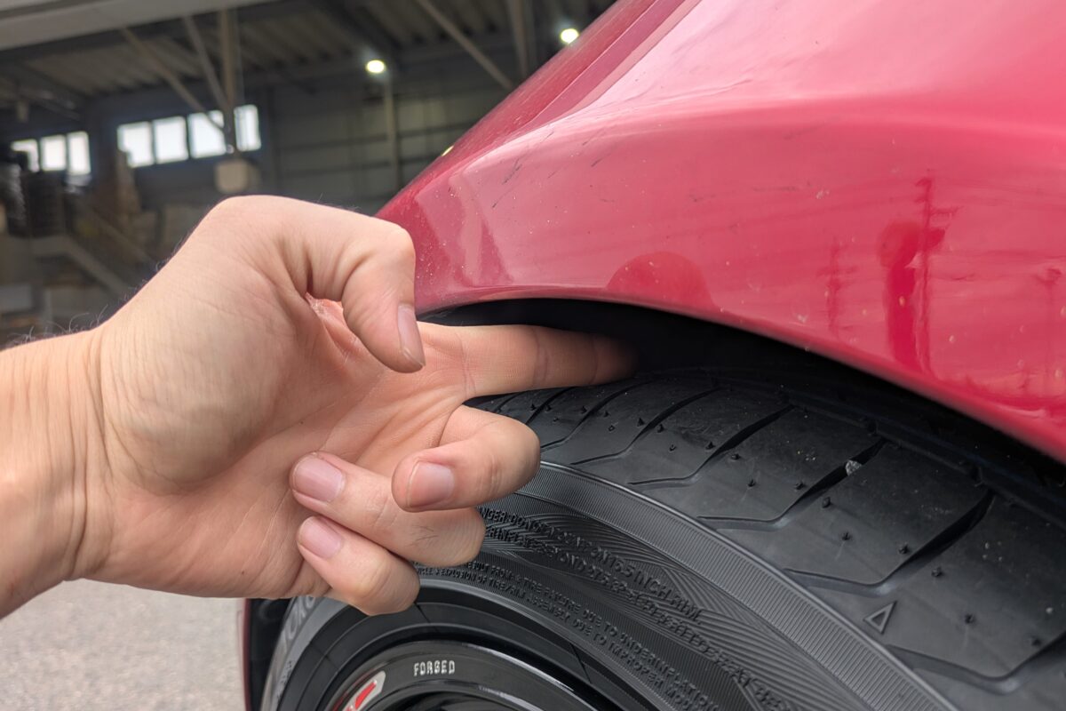 FACE-4という攻めたサイズを美しくフェンダー内に収めるため、今回はタイヤ&ホイールの装着に合わせて装着されていた車高調の車高調整とアライメント調整を同時施工させていただきました。入庫時は指2本半ぐらいのフェンダークリアランスでした。