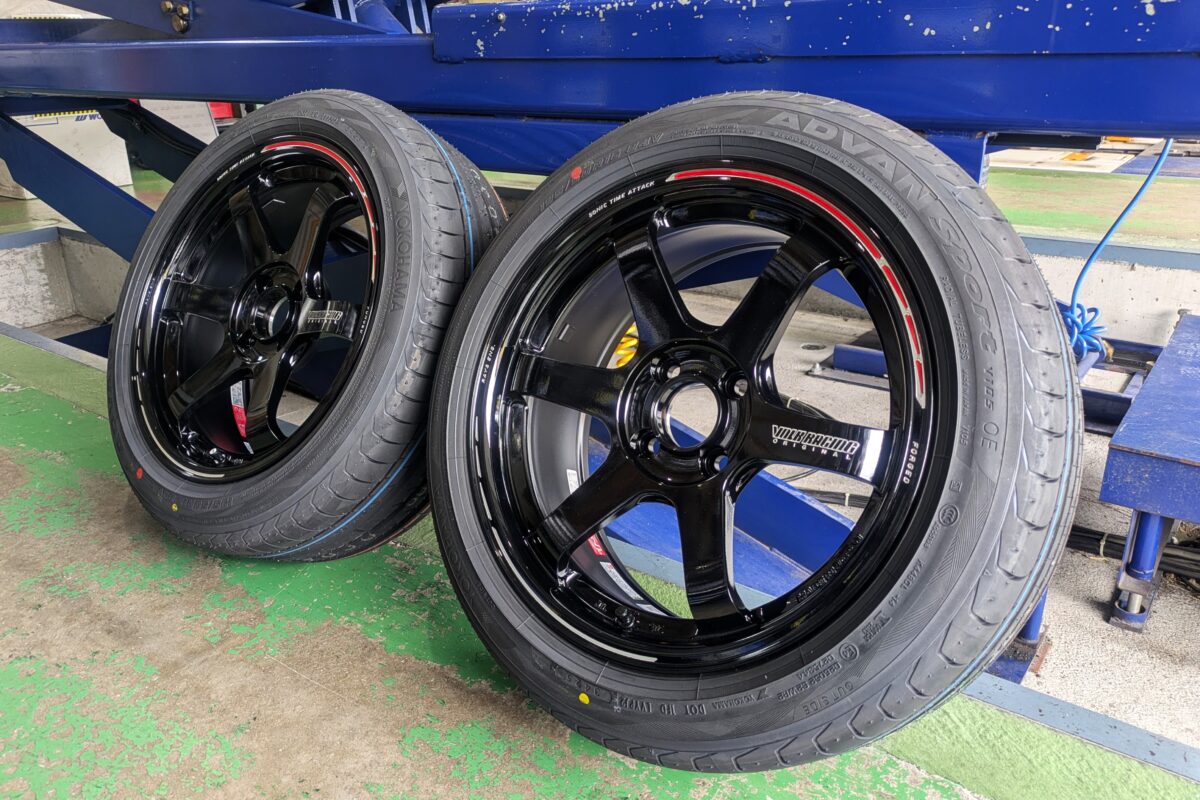 装着したのはVOLK RACING TE37 SONIC タイムアタックエディション。伝統の6本スポークに深紅のライン「REDOT(リドット)」が刻まれた限定カラーモデルです。