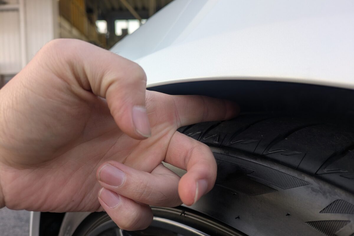 純正状態のフロントフェンダークリアランスは指2本に少し余裕があります。