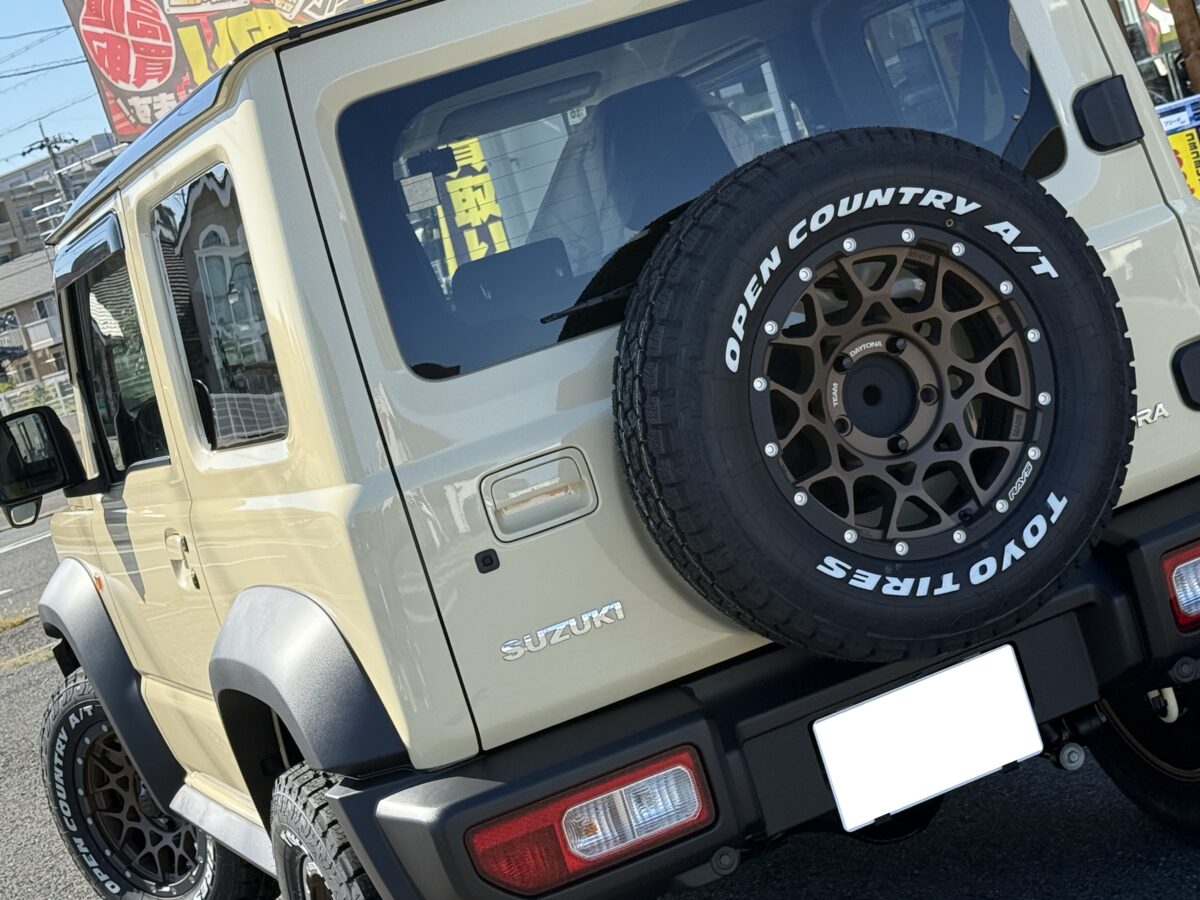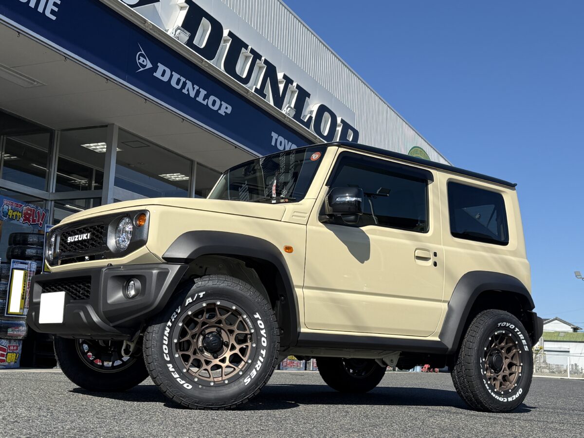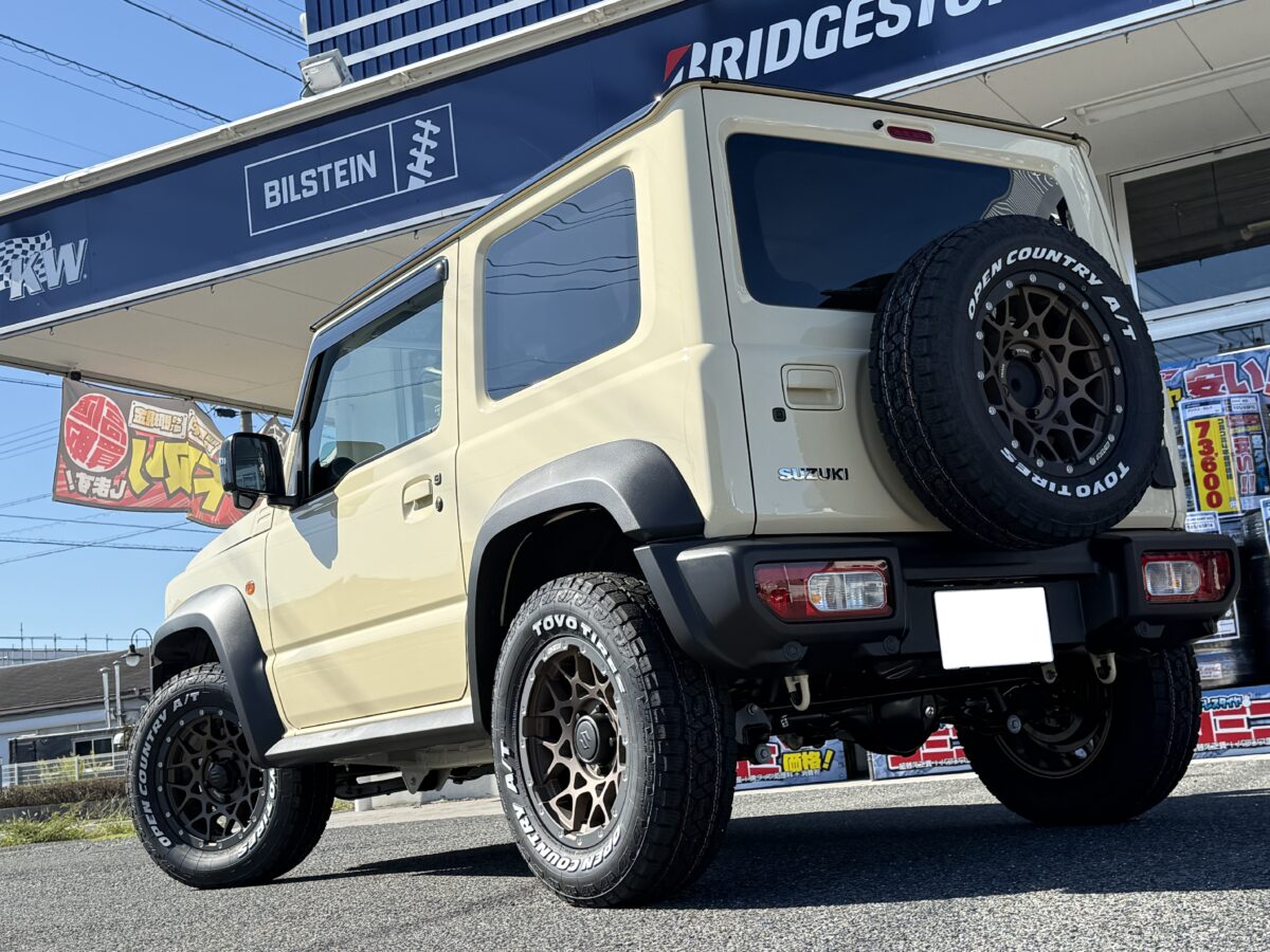 タイヤ外径を少し大きくした「215/70R16」をサイズ選定したことで、フェンダーの隙間も埋まり、本来のイメージである「ジムニーシエラ」に相応しい圧倒的な存在感とM8のメッシュデザインが都会的で洗練されたオーナー様お好みへと変貌しました。