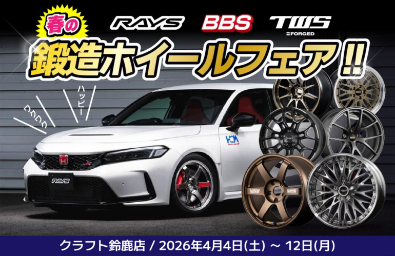 鈴鹿店恒例のビッグイベント「春の鍛造ホイールフェア」を、今年も開催いたします! ● 期間:2026年4月4日(土)~12日(日) ● 出展・展示予定メーカー: RAYS / BBS / TWS